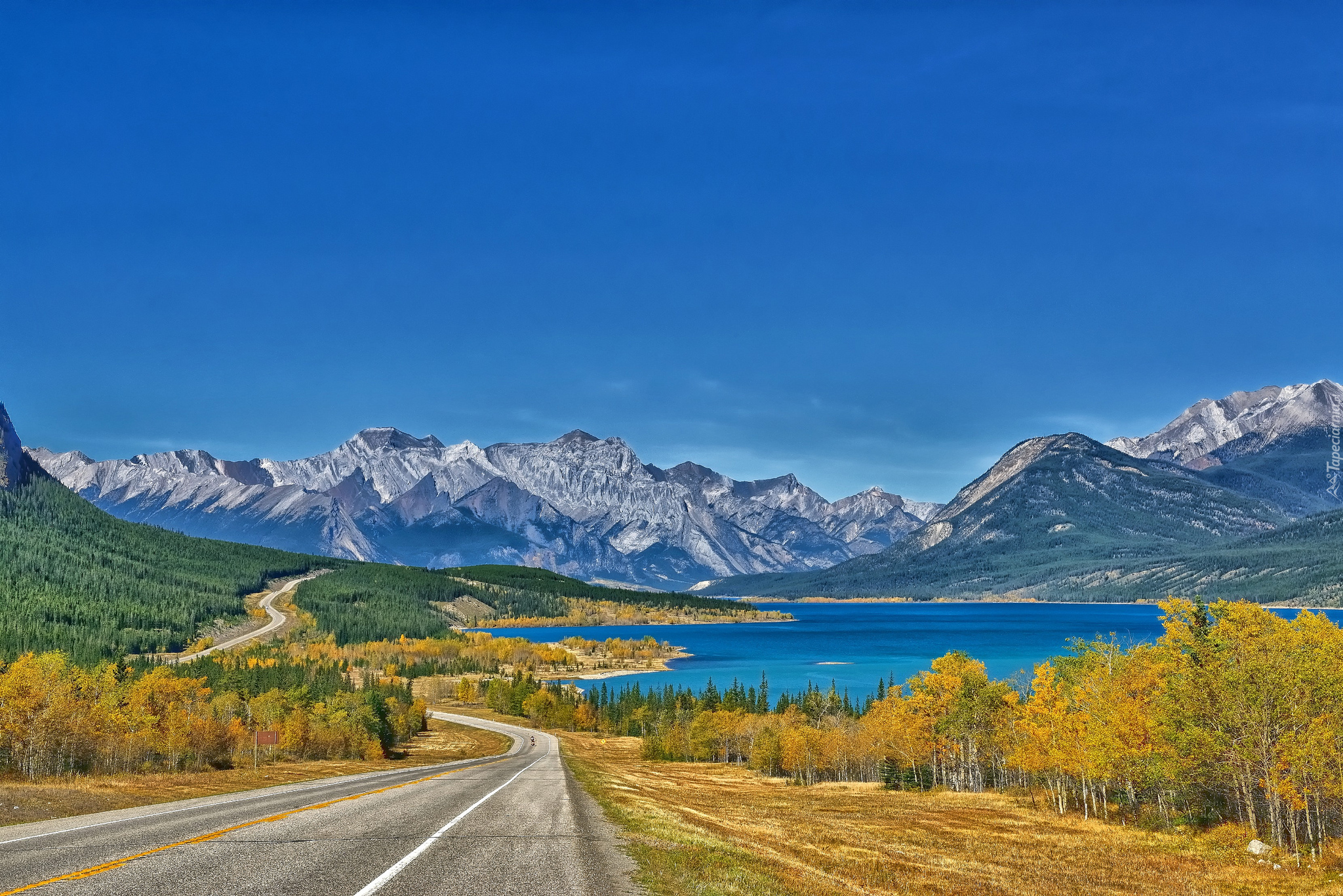 Edytor tapety: Droga, Lasy, Jezioro, Góry