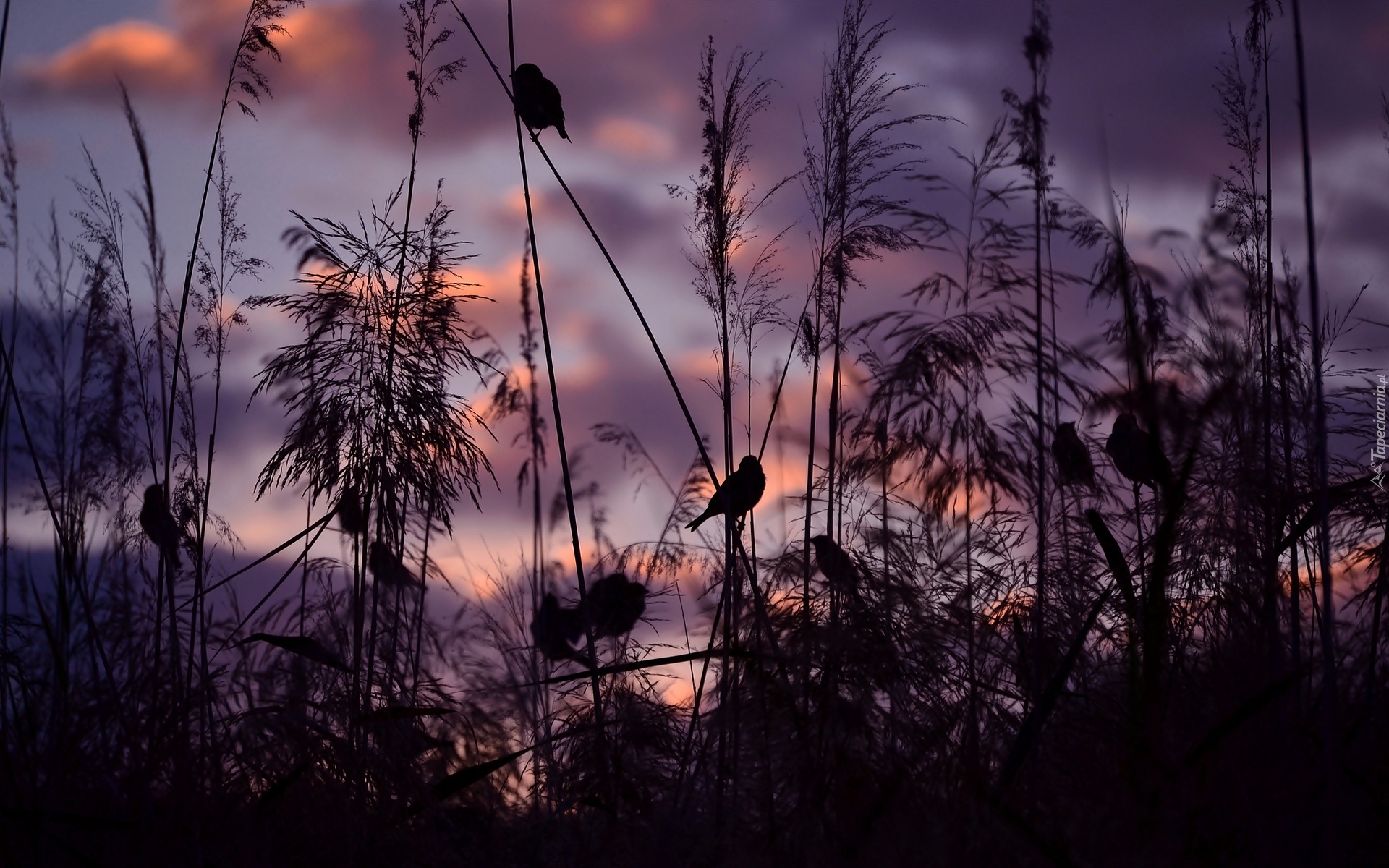 Edytor tapety: Zachód, Słońca, Trawy, Ptaszki