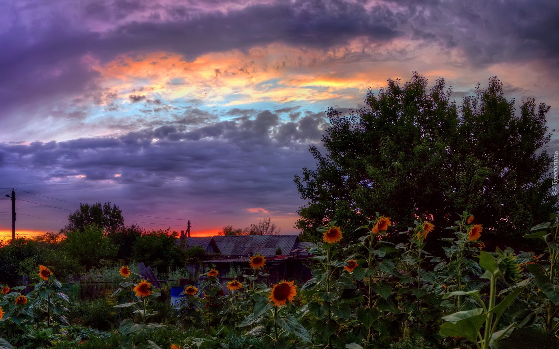 Edytor tapety: Zachód, Słońca, Chmury, Słoneczniki