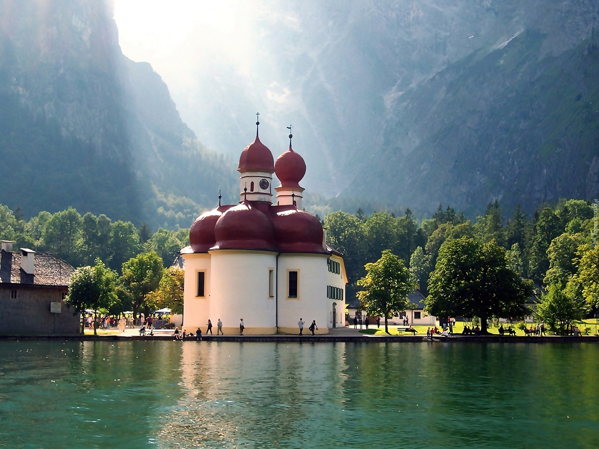 Edytor tapety: Bawaria, Góry, Jezioro, Koenigssee, Kościół, Budynek, Drzewa
