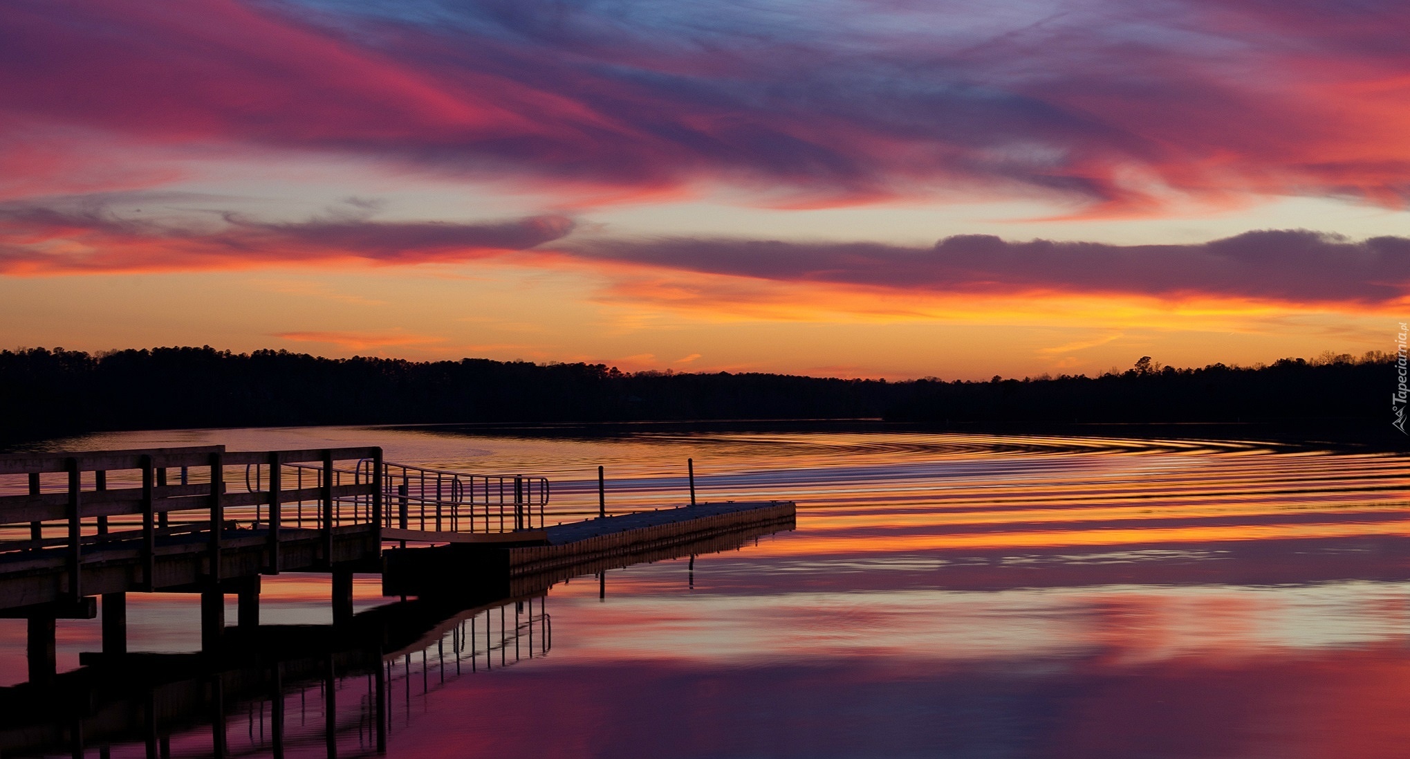 Edytor tapety: Zachód, Słońca, Jezioro, Lasy, Pomost