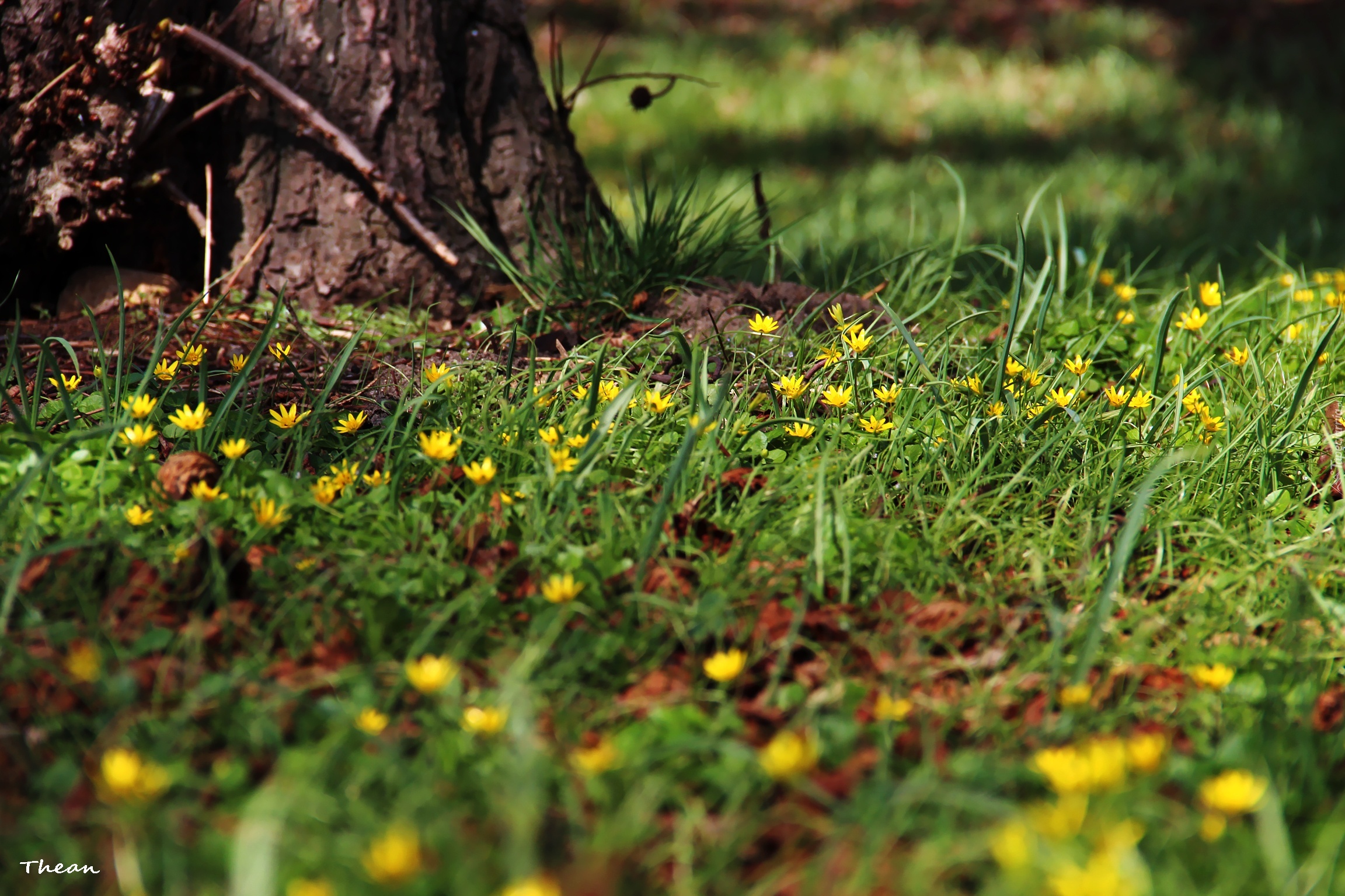 Edytor tapety: Ziarnopłon Wiosenny, Żółte, Kwiaty, Trawa, Drzewo