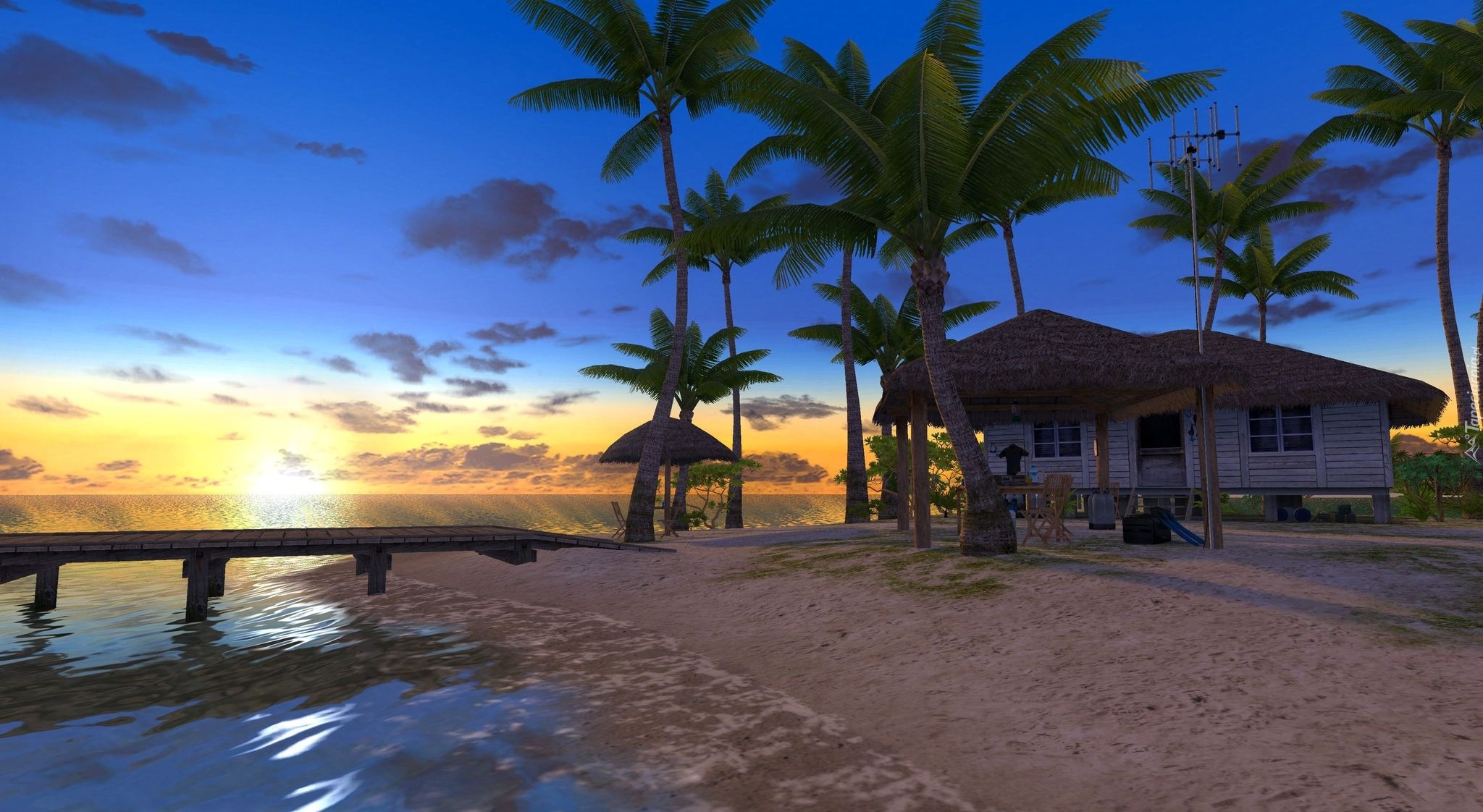 Edytor tapety: Ocean, Plaża, Dom, Palmy, Pomost