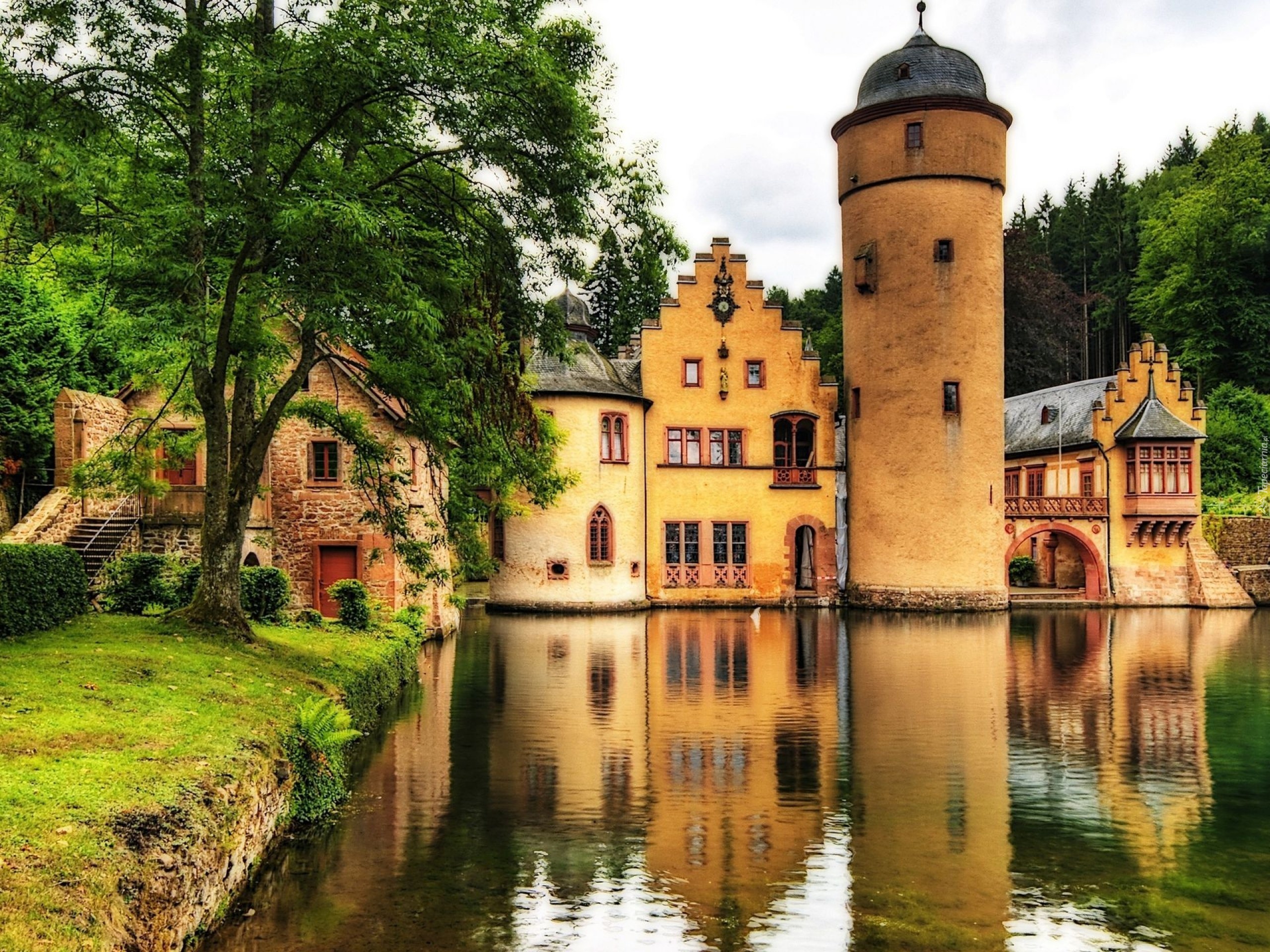 Edytor tapety: Niemcy, Bawaria, Zamek wodny Mespelbrunn Castle, Rzeka Elsava, Odbicie