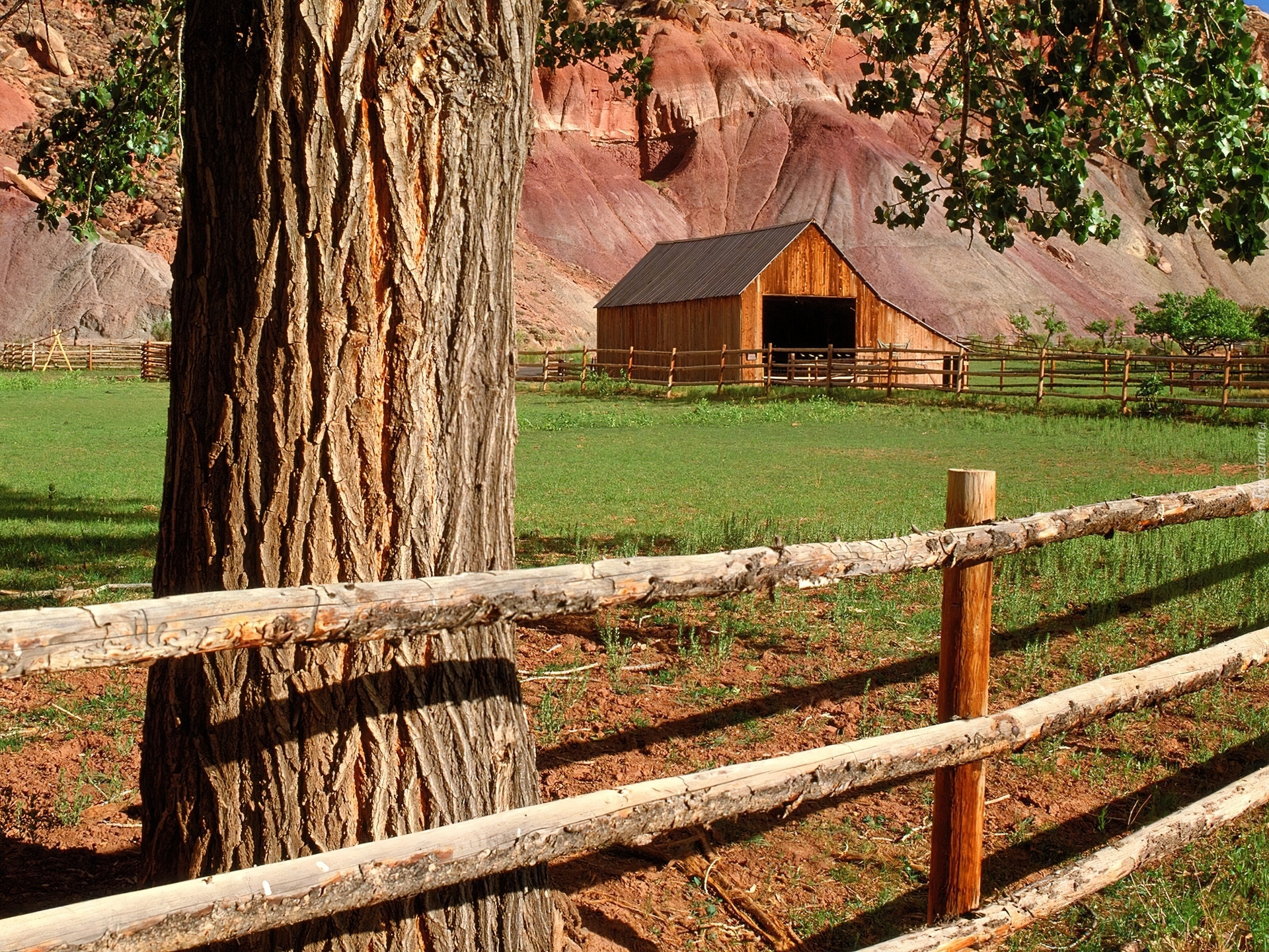 Edytor tapety: Szopa, Płot, Łąka, Góry