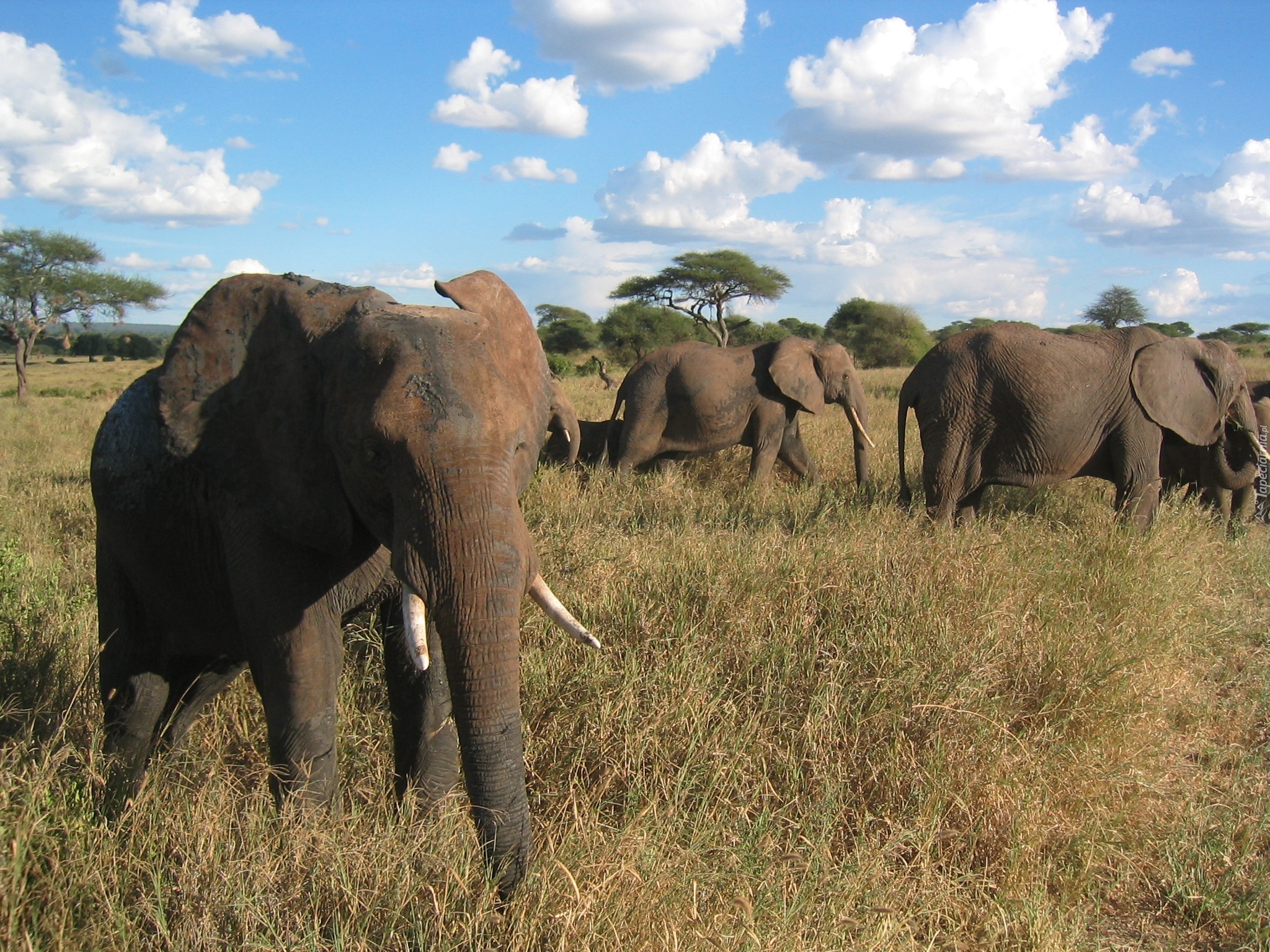 Edytor tapety: Słonie, Sucha, Trawa, Chmurki, Serengeti