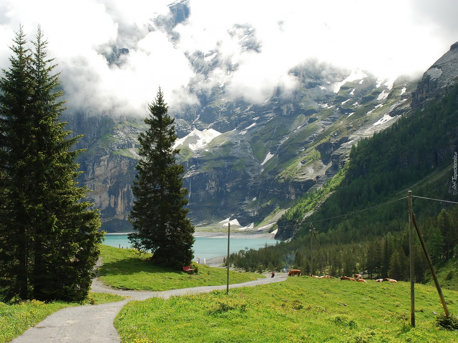 Edytor tapety: Góry, Jezioro, Chmury, Świerki