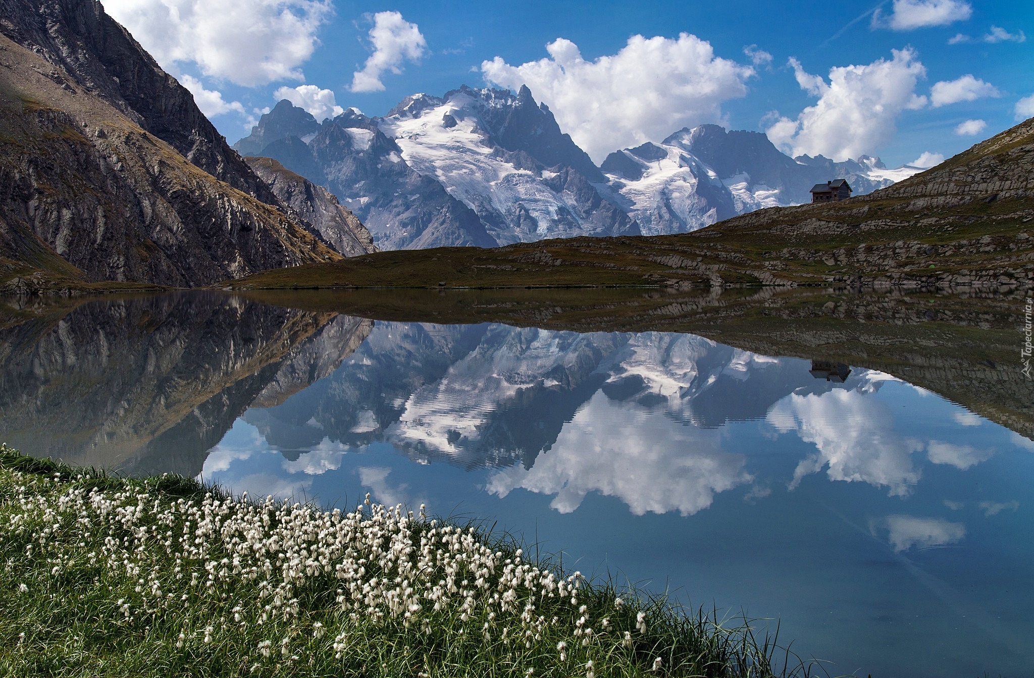 Edytor tapety: Jezioro, Góry, Odbicie, Białe, Roślinki