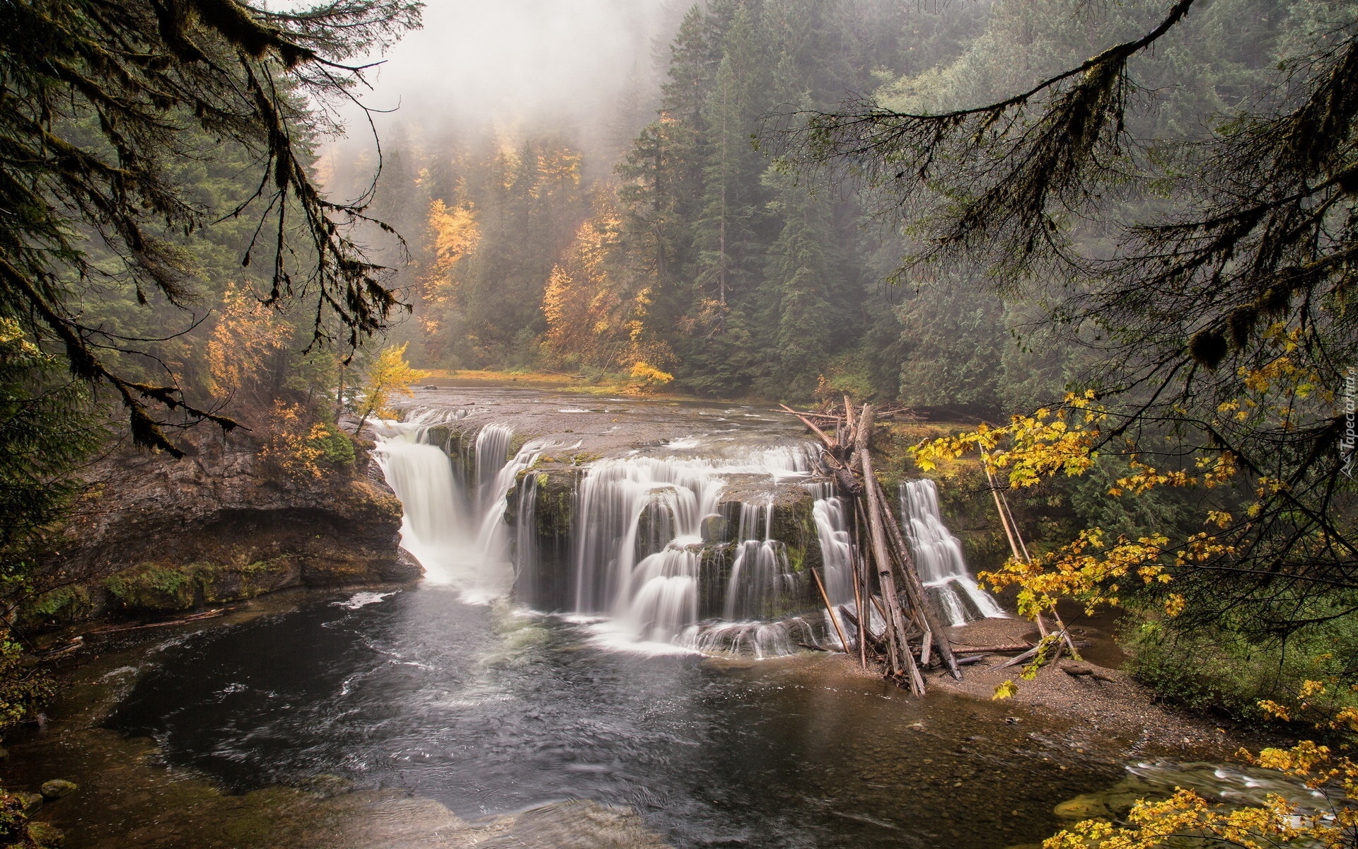 Edytor tapety: Rzeka, Wodospad, Las, Mgła