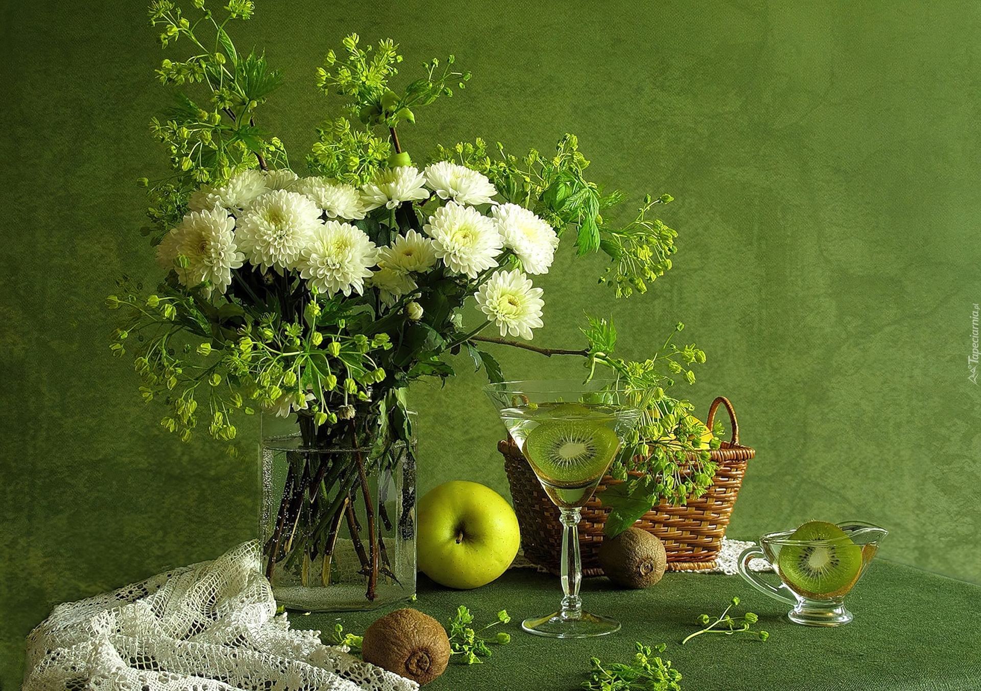 Edytor tapety: Bukiet kwiatów, Chryzantemy, Kompozycja, Jabłko, Kiwi