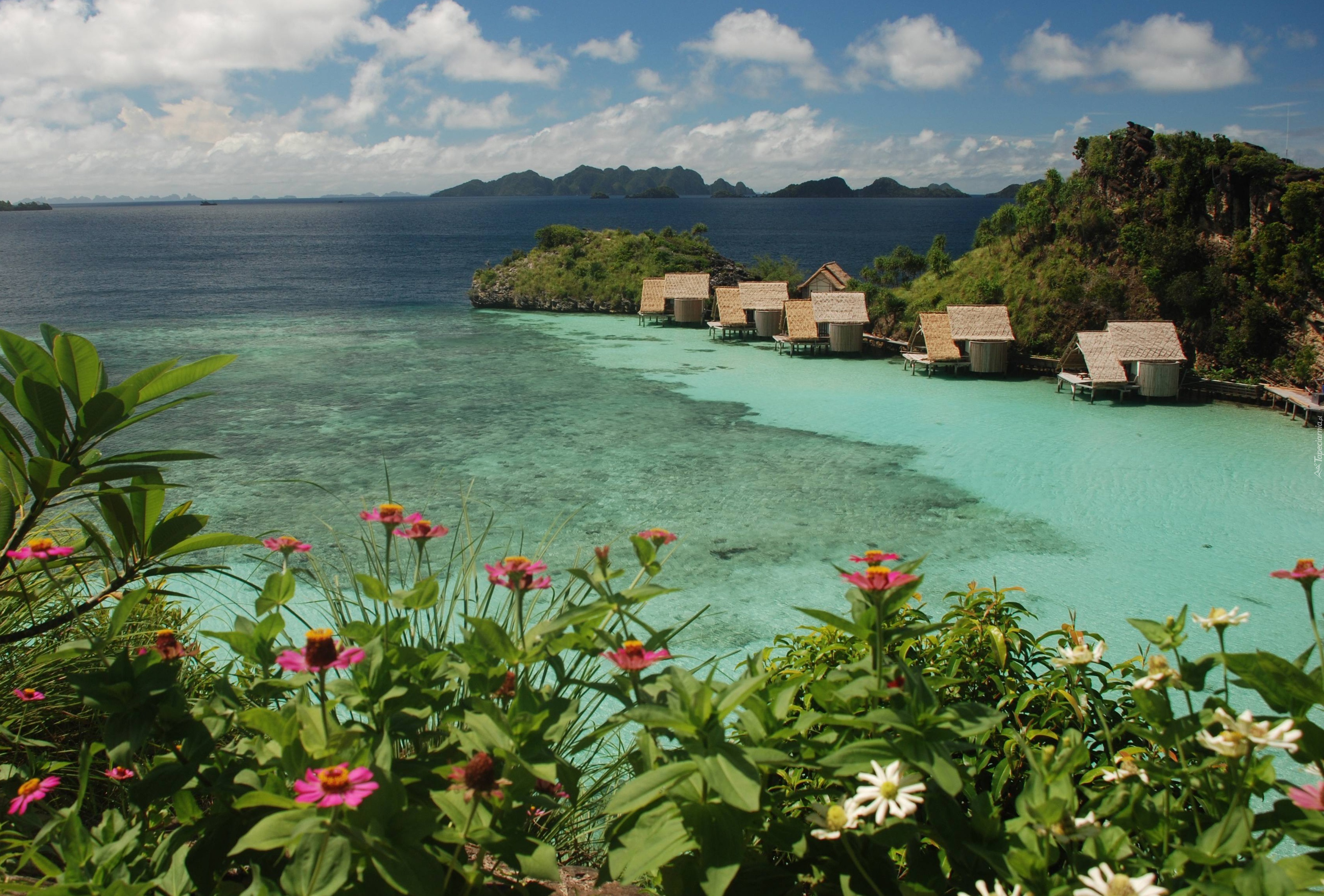 Edytor tapety: Góry, Morze, Domki, Kwiaty