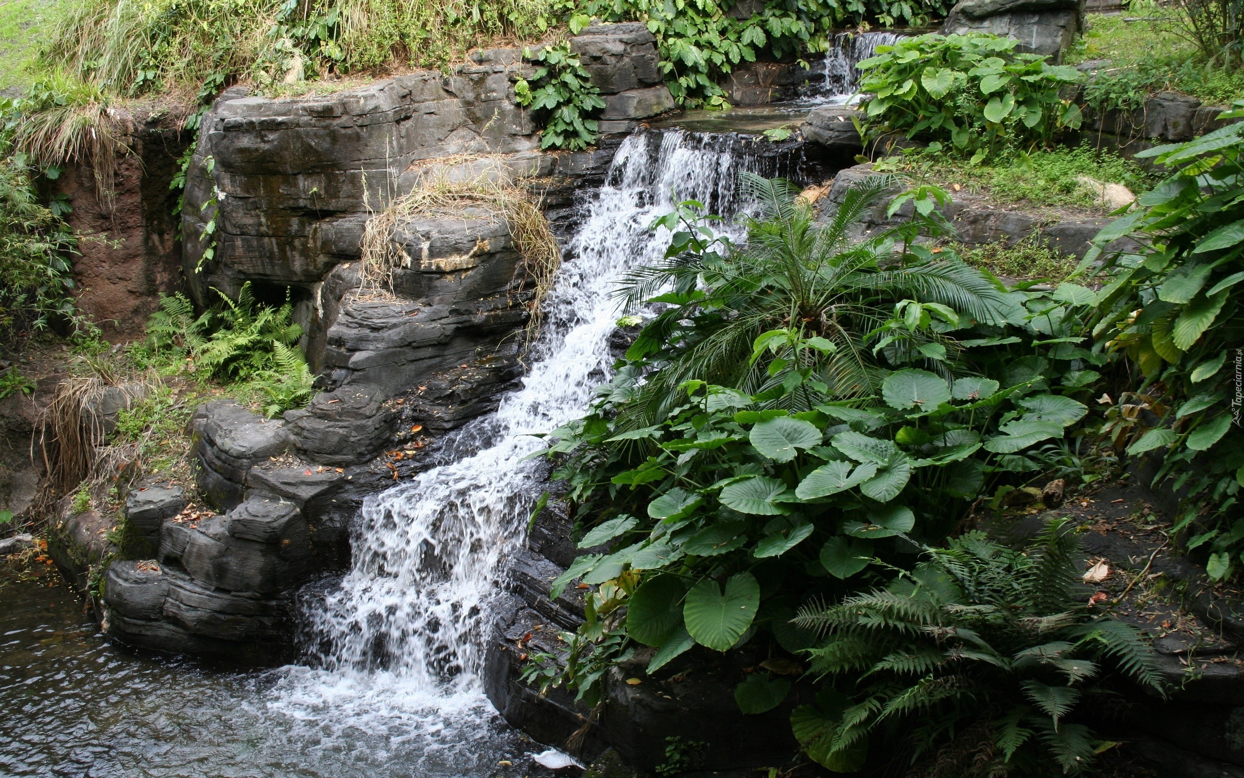 Edytor tapety: Mały, Wodospad, Skały, Paprocie, Rośliny