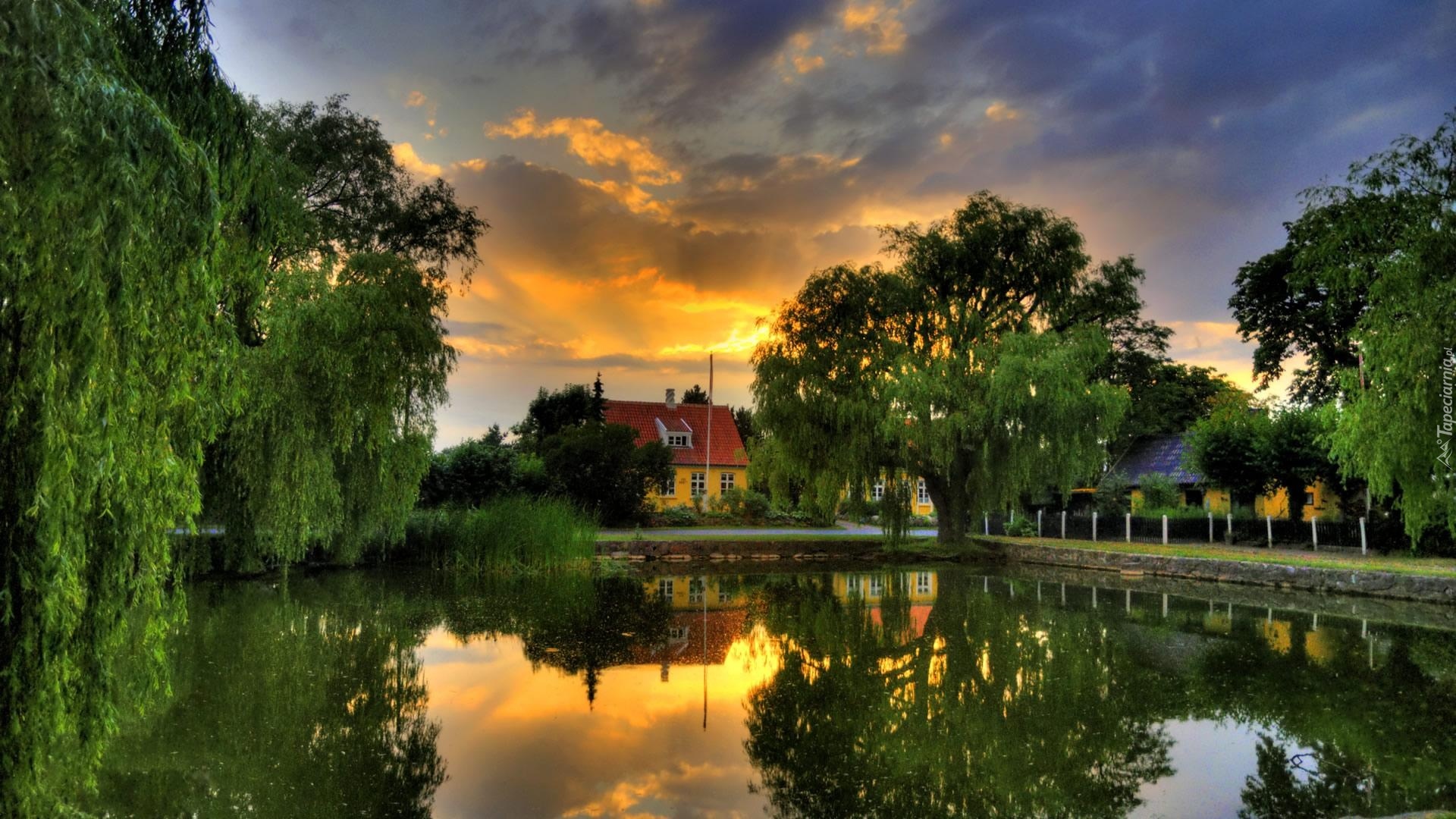 Edytor tapety: Wierzby, Płaczące, Domy, Chmury, Odbicie