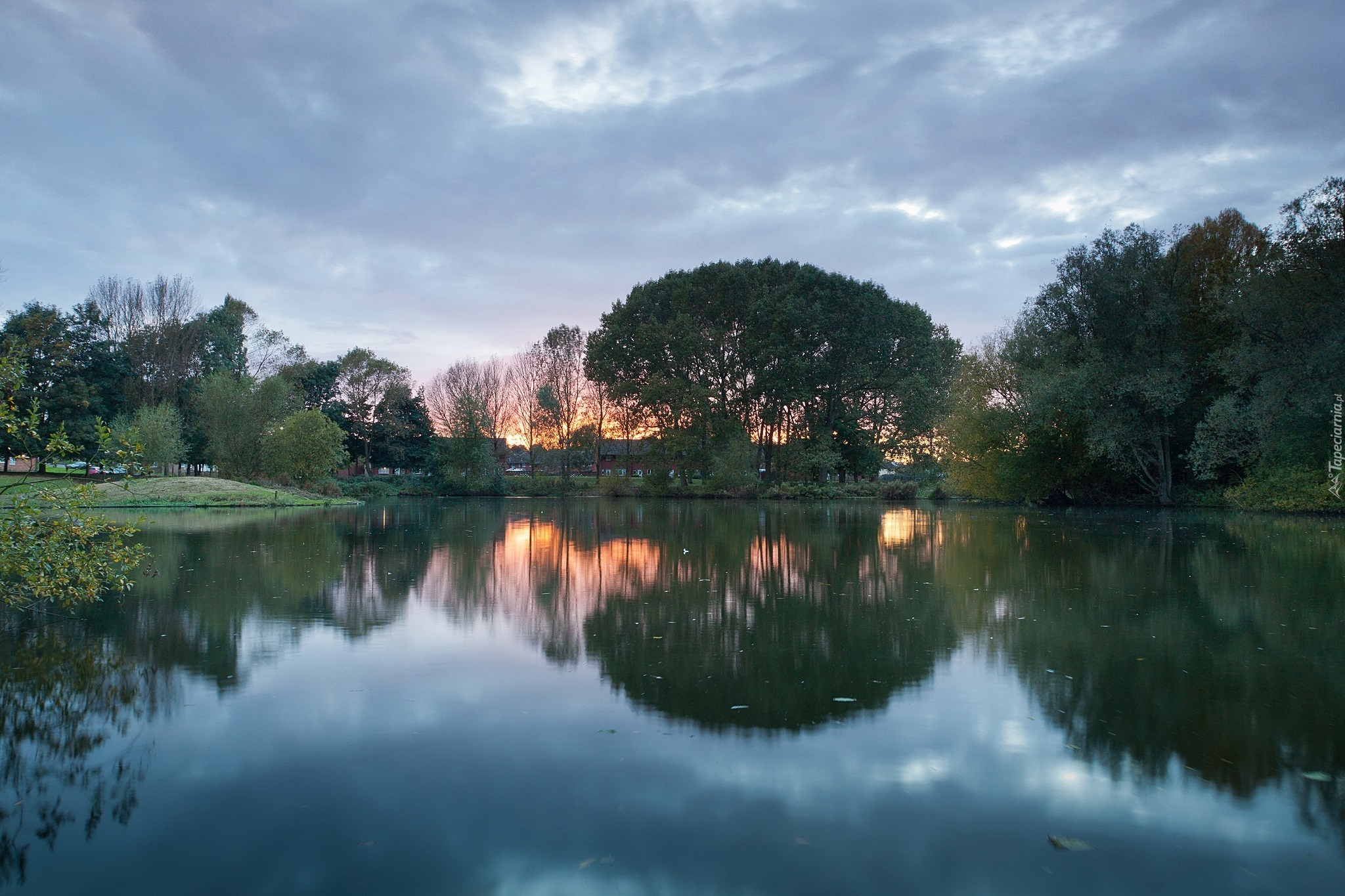 Edytor tapety: Domy, Drzewa, Jezioro, Zachód Słońca