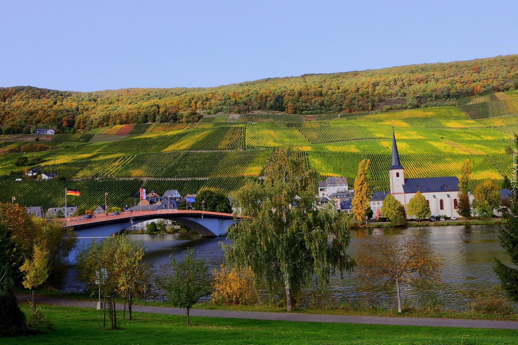 Edytor tapety: Rzeka, Most, Kościół, Uprawne, Pola, Niemcy