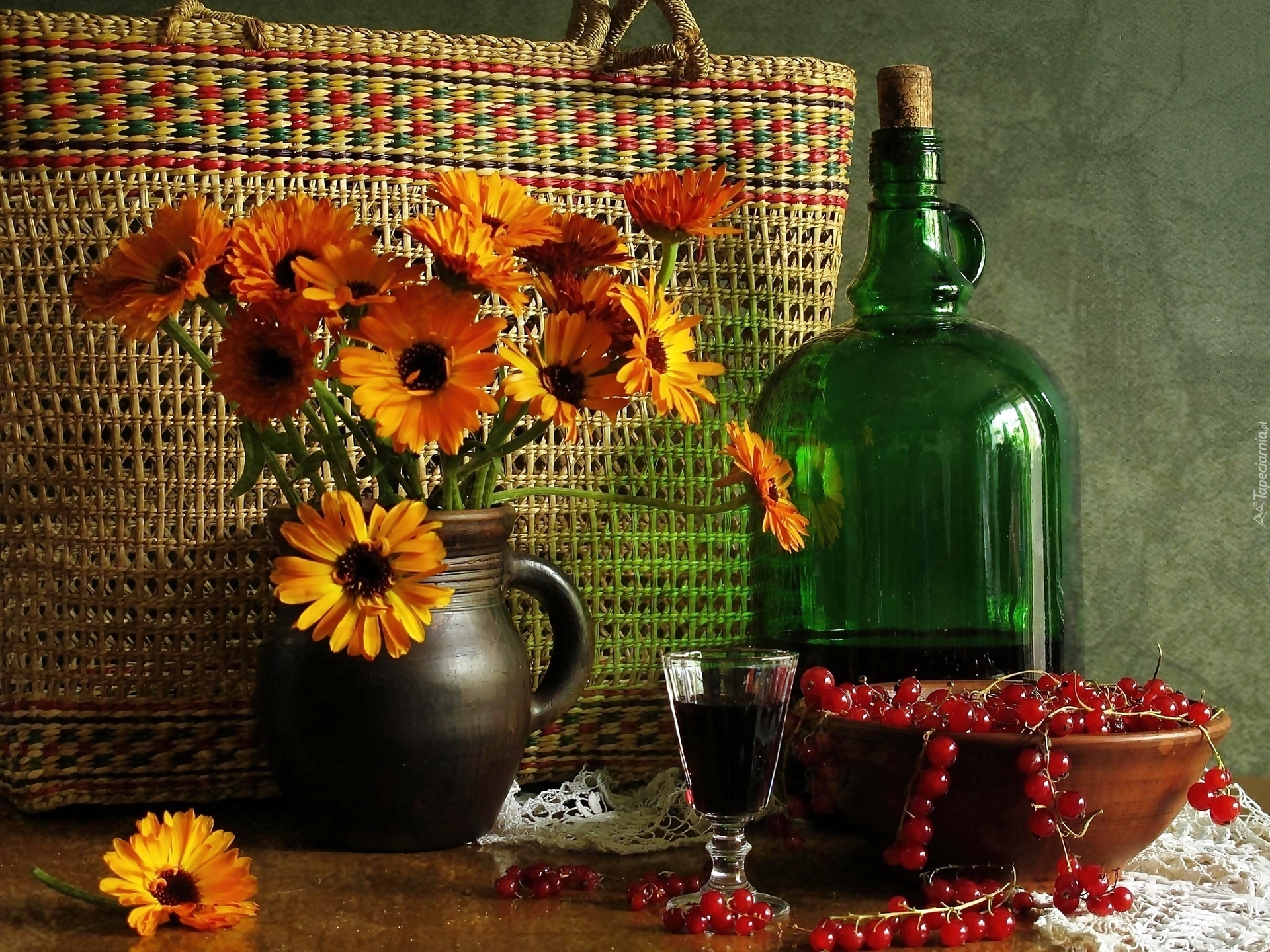 Edytor tapety: Koszyk, Dzbanek, Żółte, Gerbery, Butelka