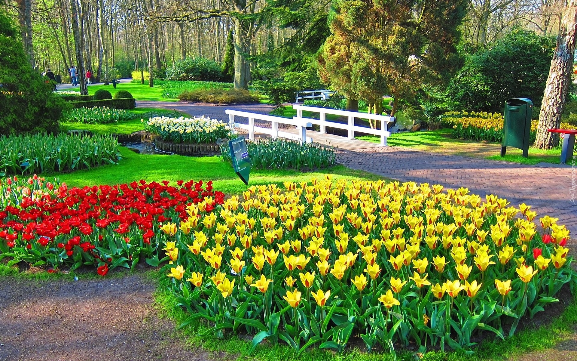 Edytor tapety: Park, Alejka, Mostek, Tulipany