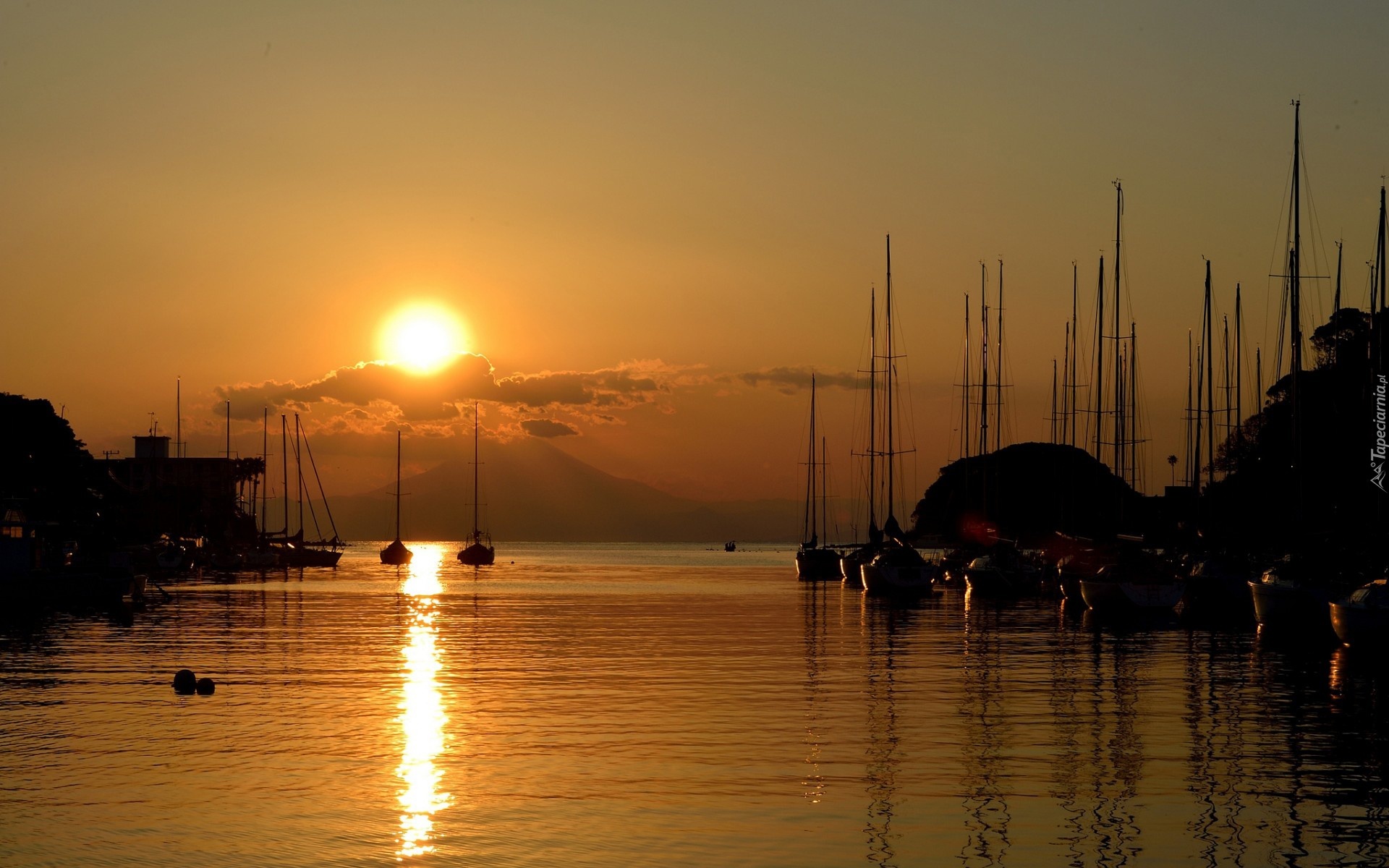 Edytor tapety: Żaglówki, Góry, Zachód słońca, Przystań