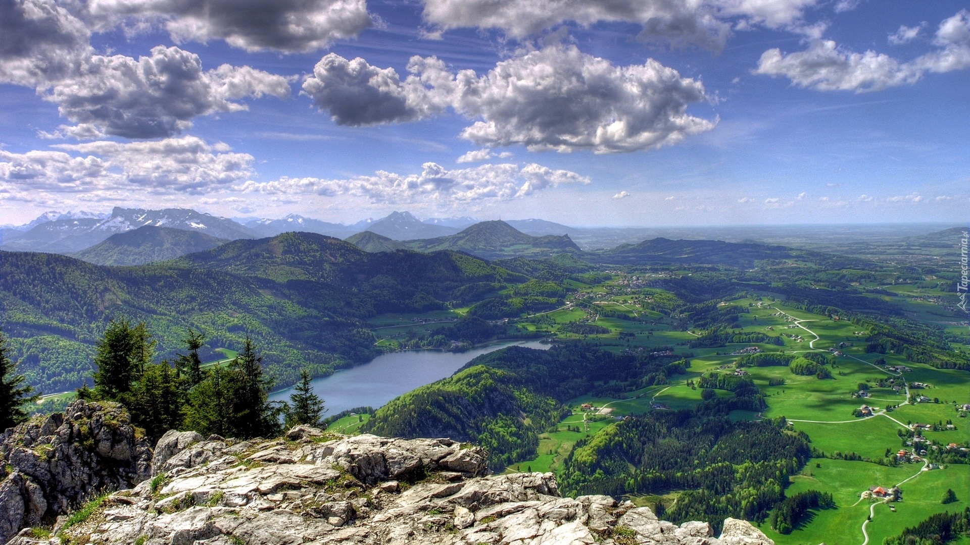 Edytor tapety: Góry, Rzeka, Farmy, Pola, Panorama