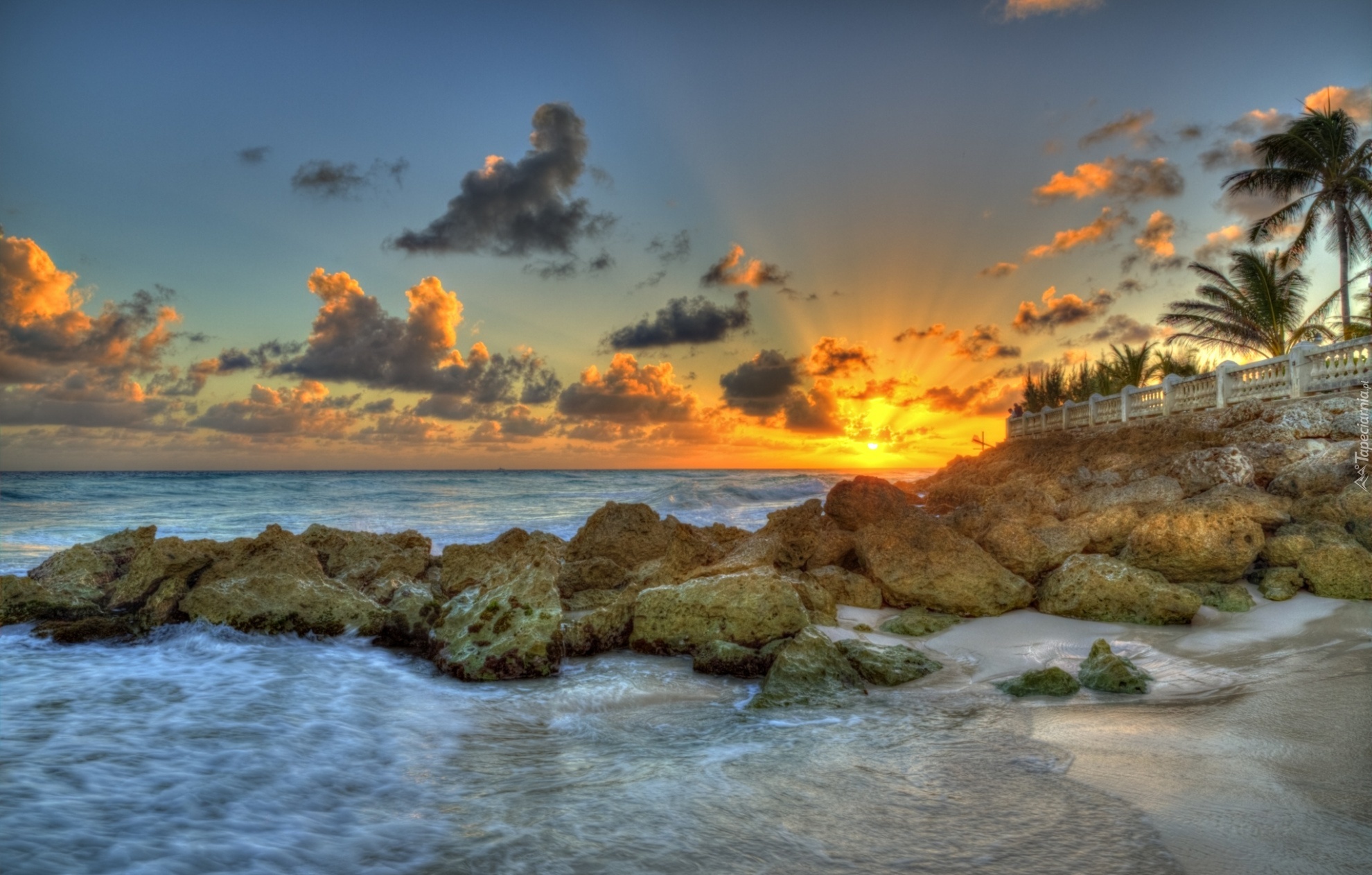Edytor tapety: Zachód, Słońca, Morze, Kamienie, Palmy