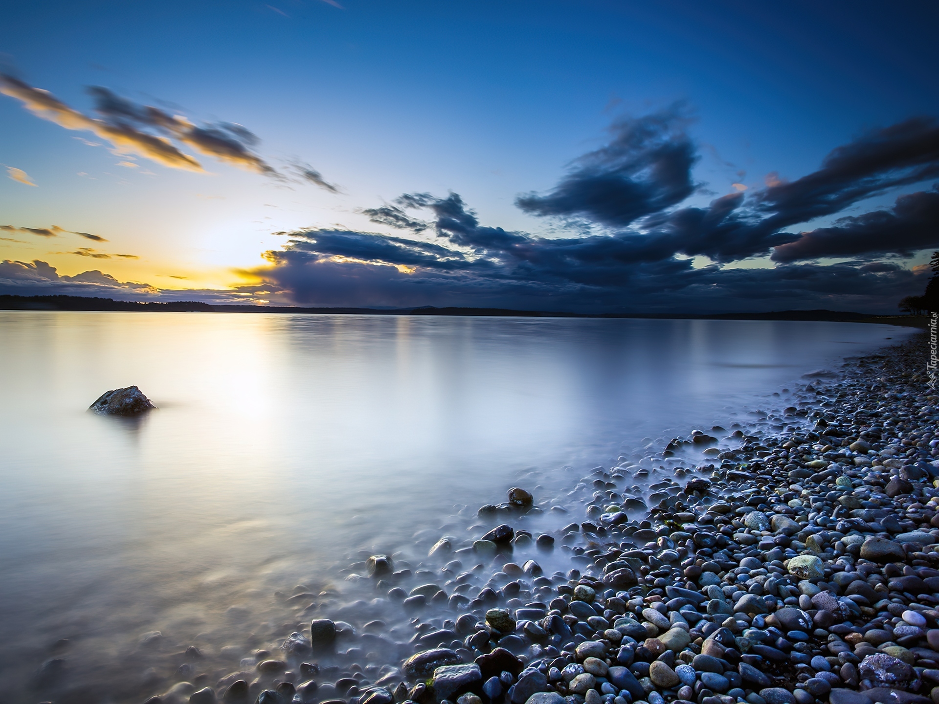 Edytor tapety: Jezioro, Kamyczki, Zachód Słońca