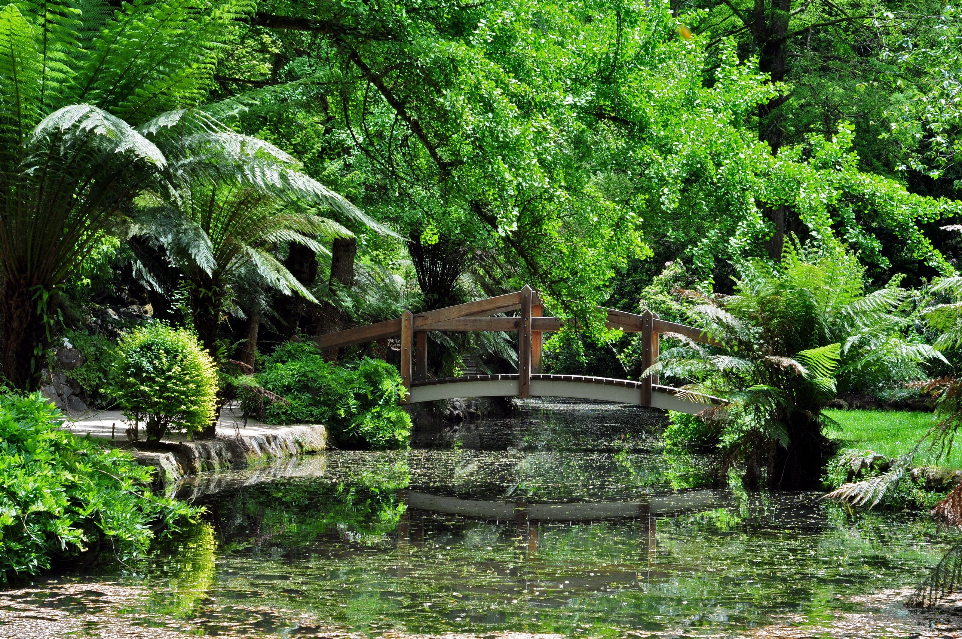 Edytor tapety: Park, Egzotyczny, Staw, Mostek, Palmy