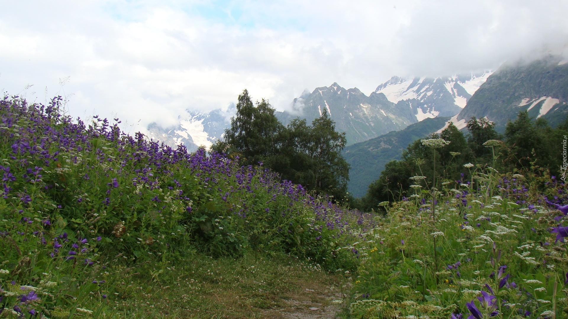 Edytor tapety: Góry, Śnieg, Kwiaty, Polne, Drzewa