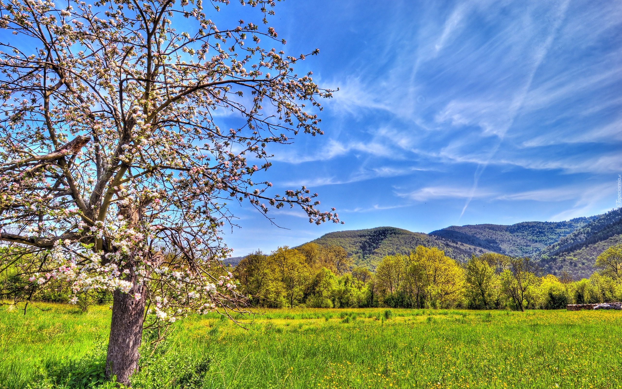 Edytor tapety: Kwitnące, Drzewo, Łąka, Góry
