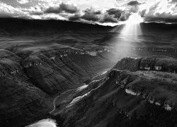 Edytor tapety: Promienie, Słońca, Chmury, Góry