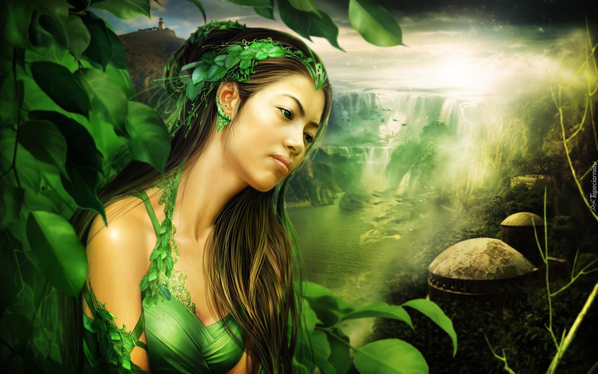 Edytor tapety: Kobieta, Wodospad, Liście