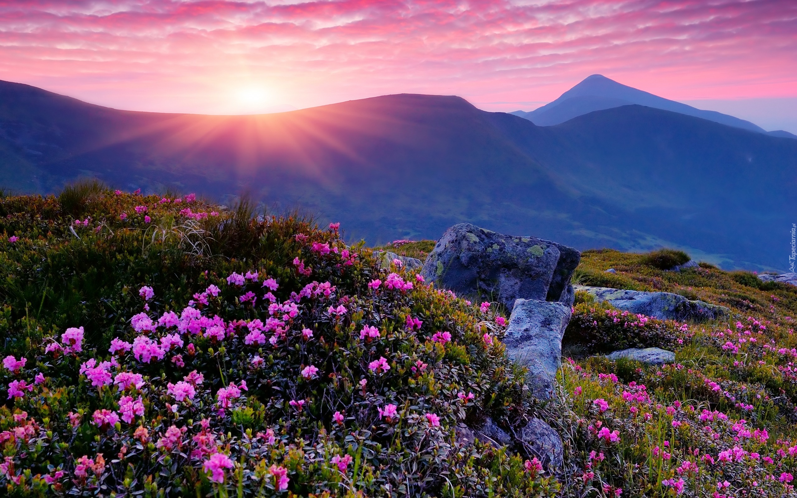 Edytor tapety: Promienie, Słońca, Góry, Kwiaty