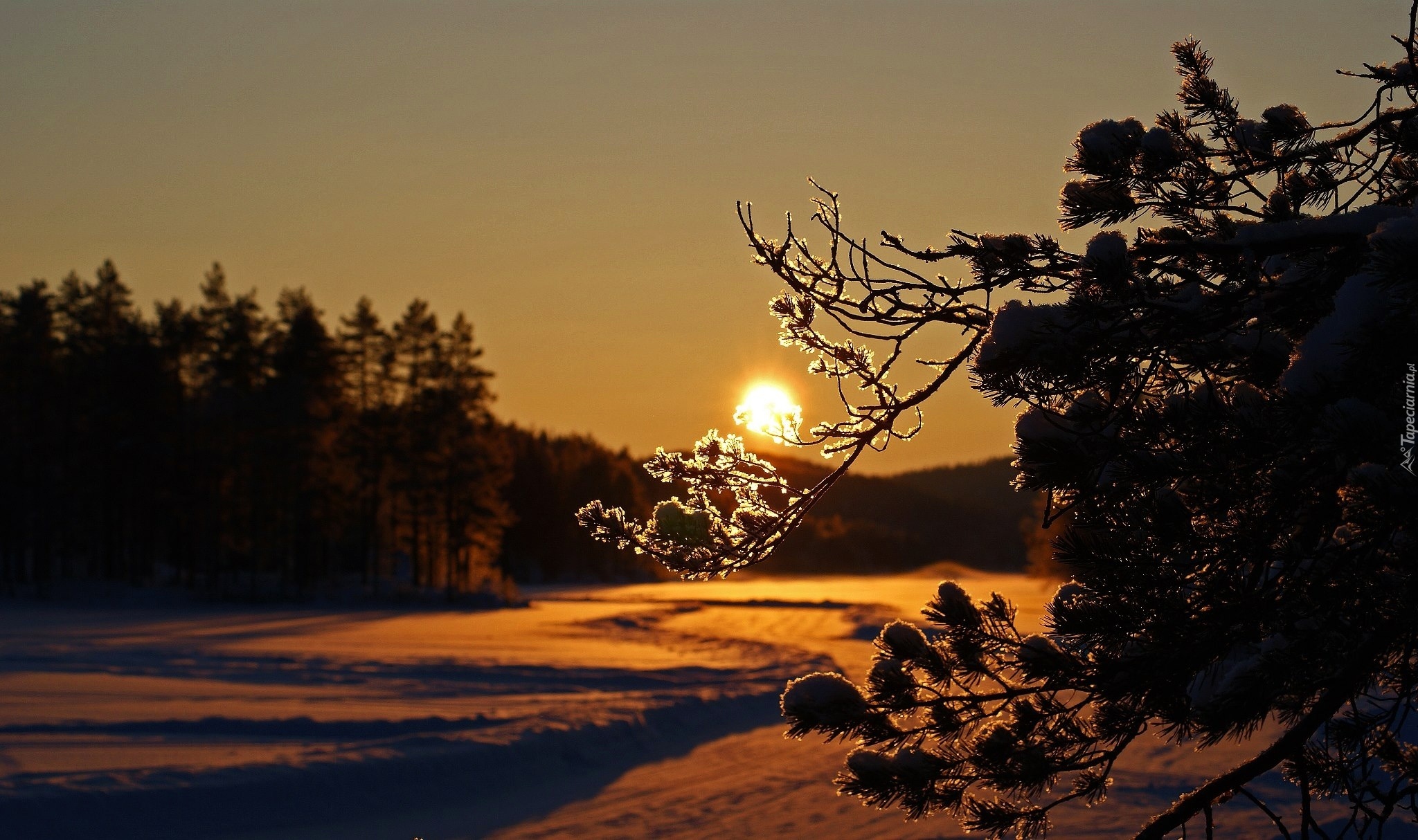 Edytor tapety: Zachód, Słońca, Las, Gałązka, Zima