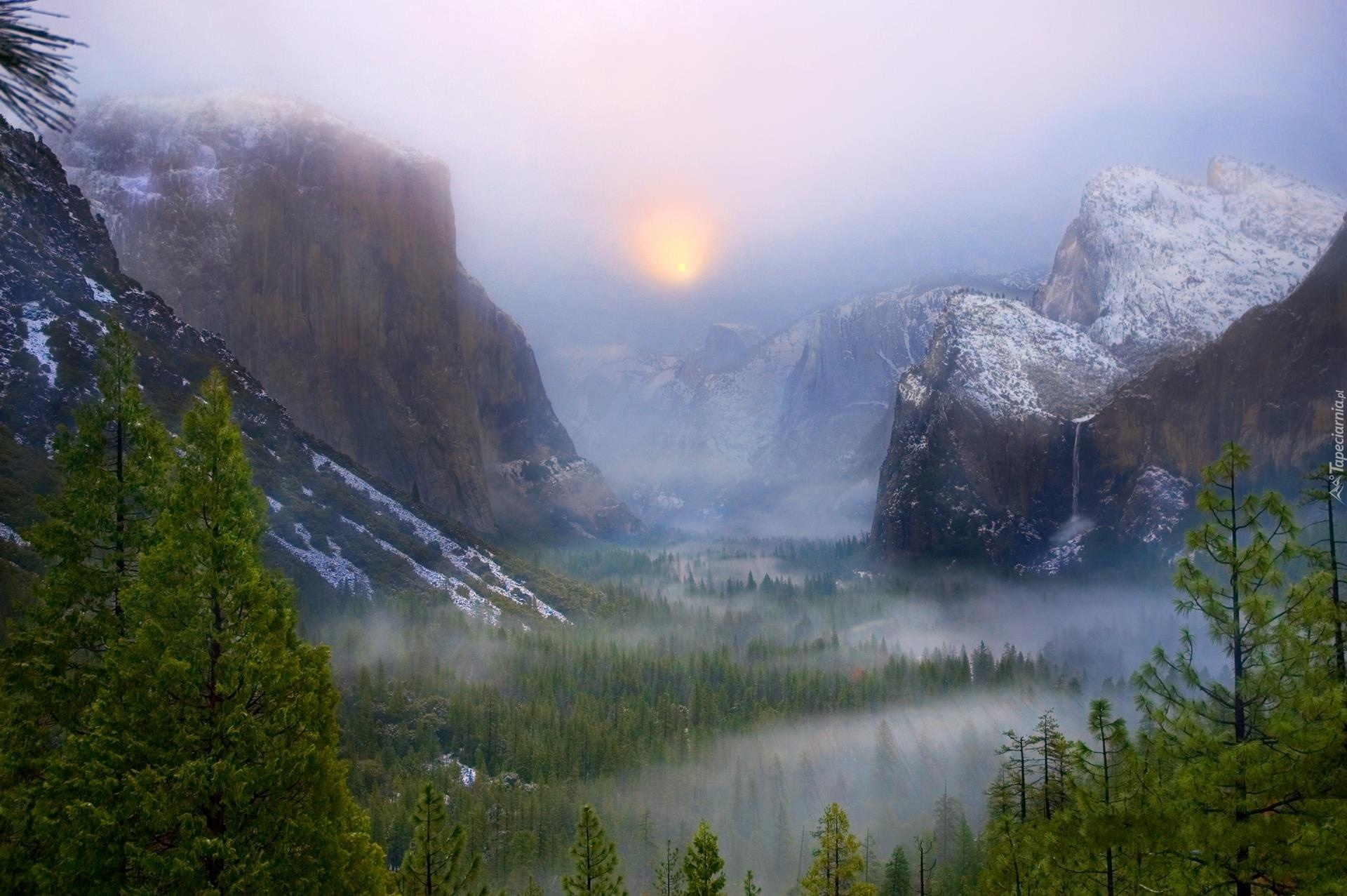Edytor tapety: Góry, Lasy, Wodospad, Mgła, Wschód, Słońca