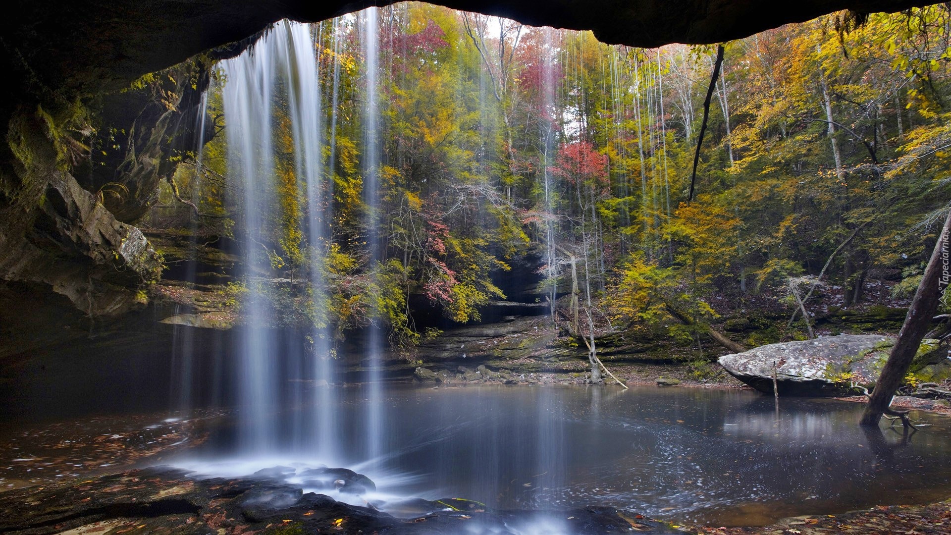 Edytor tapety: Las, Wodospad, Grota