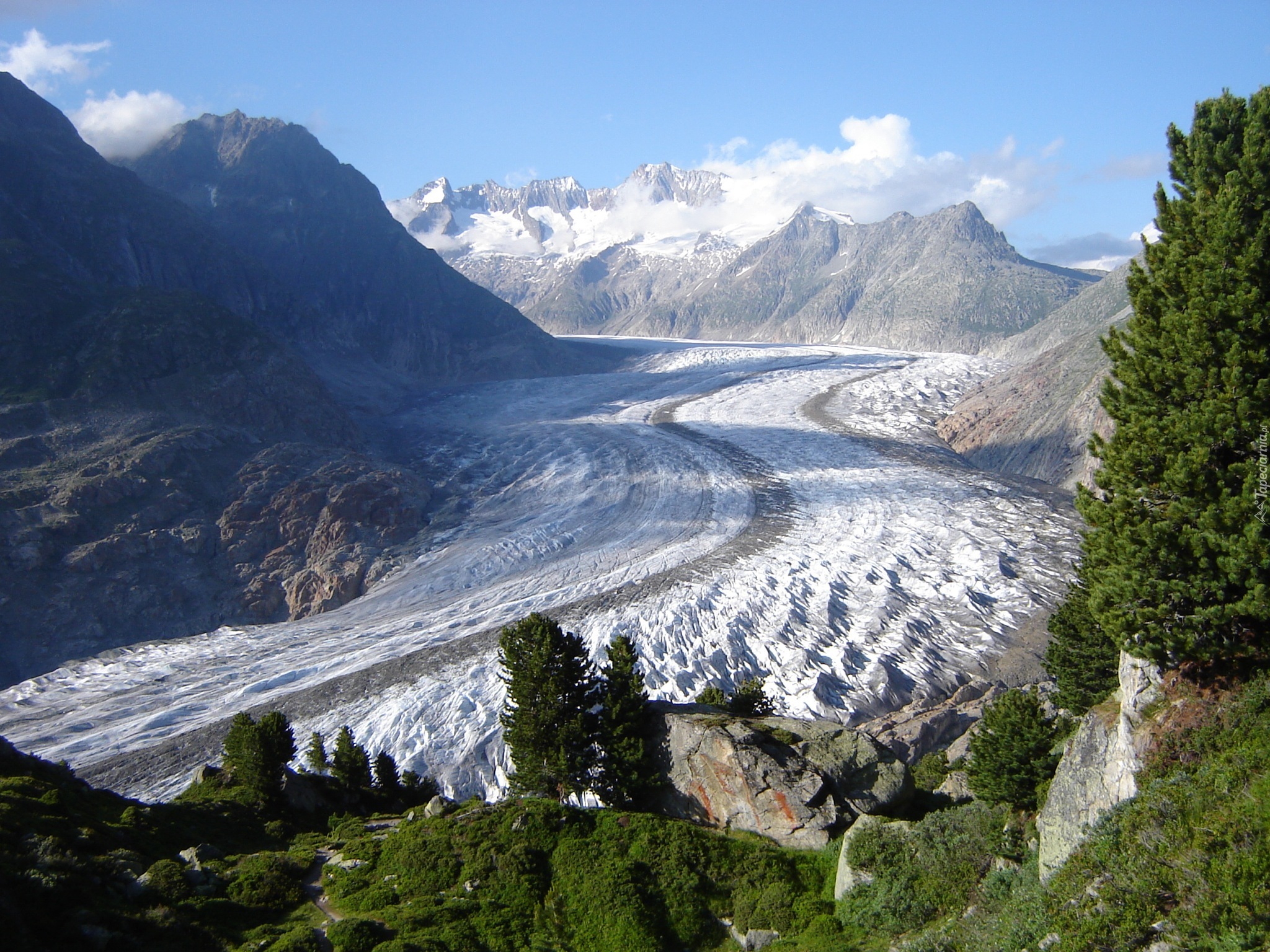 Edytor tapety: Alpy, Berneńskie, Lodowiec, Aletschgletscher, Rośliny, Szwajcaria