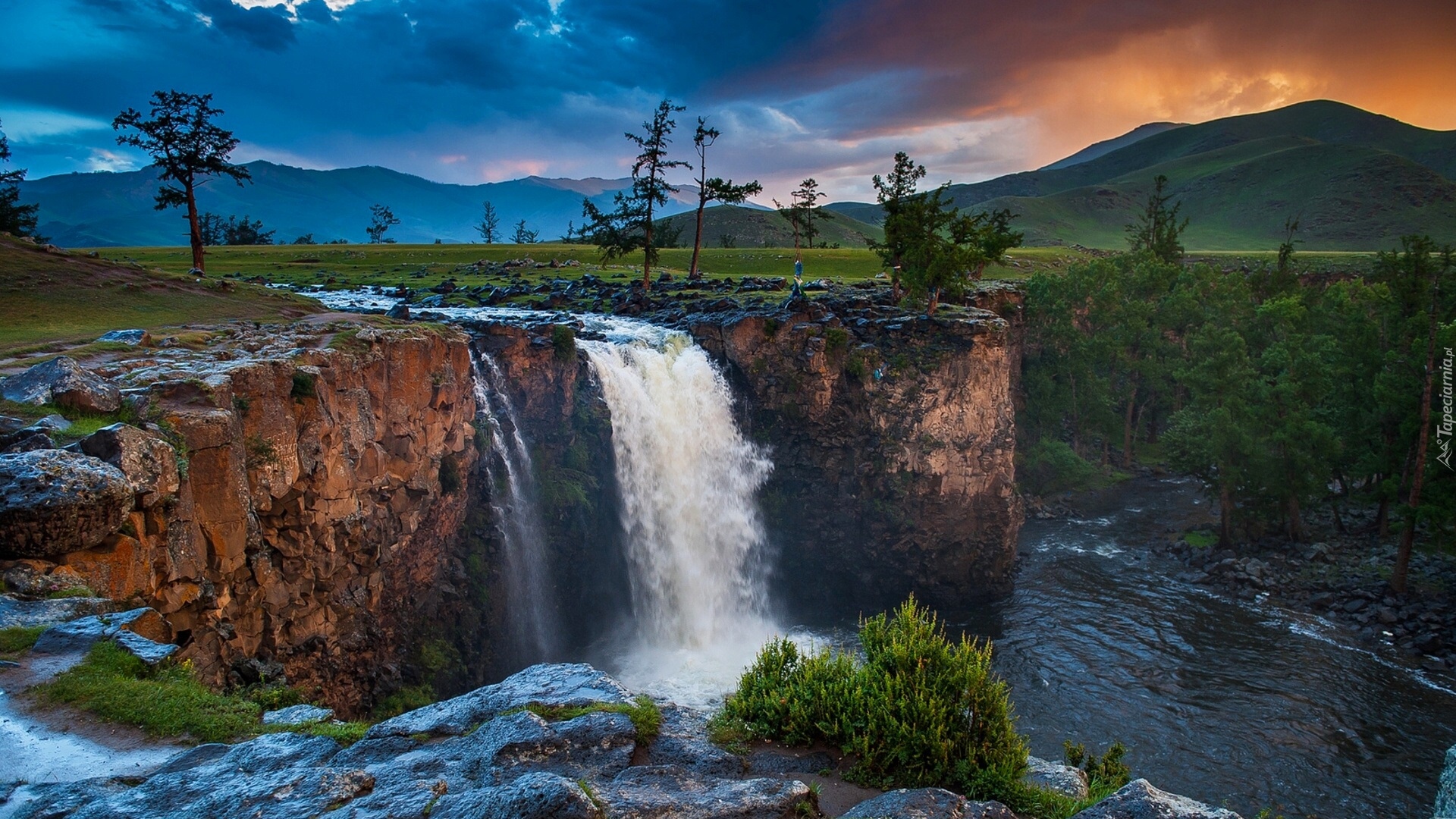 Edytor tapety: Wodospad, Rzeka, Góry, Chmury