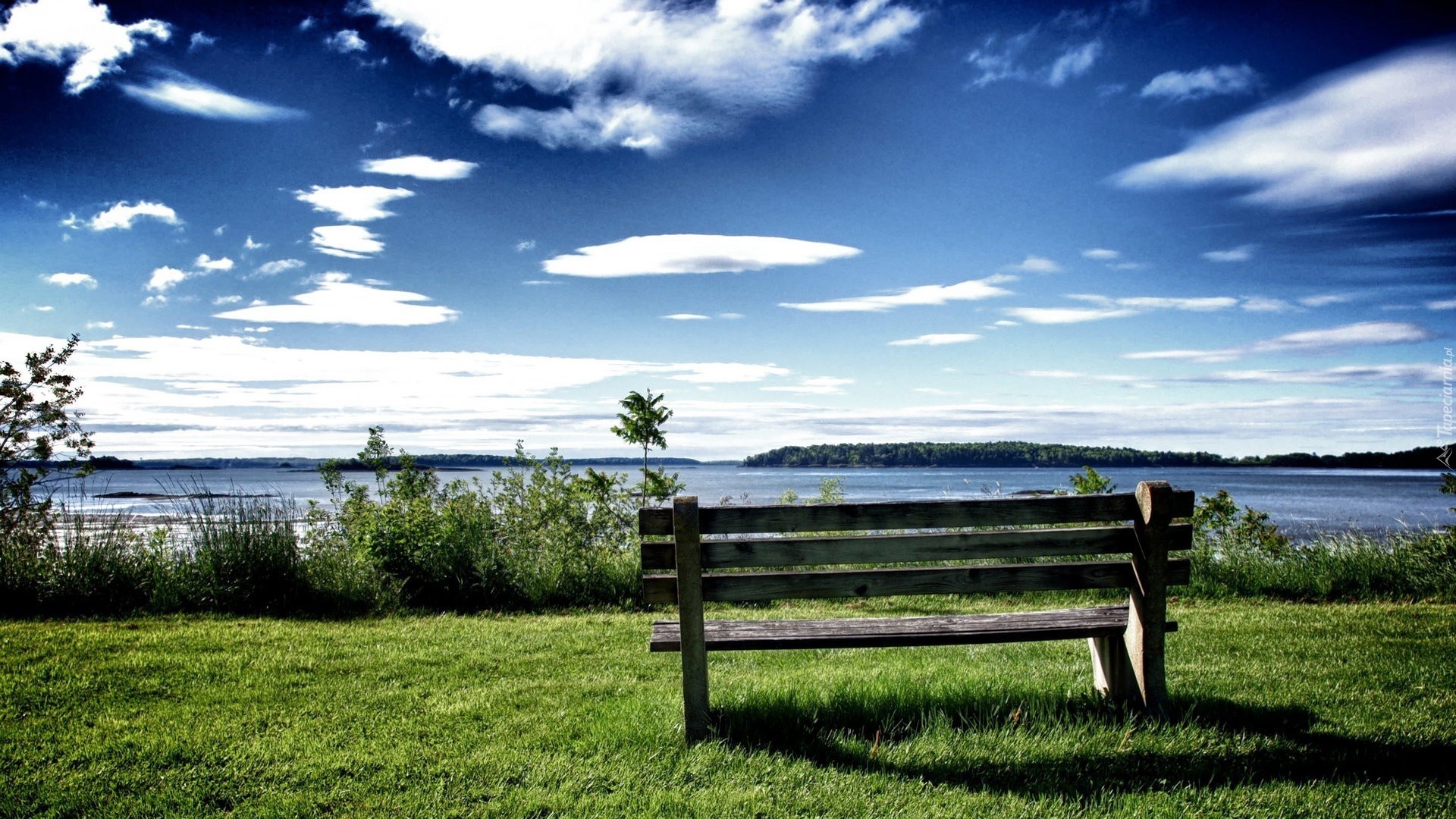 Edytor tapety: Jezioro, Lasy, Łąka, Ławka, Chmury