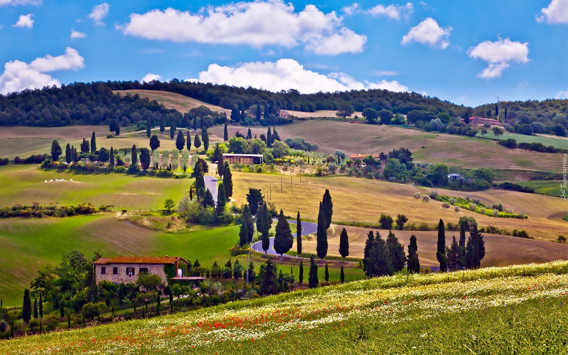 Edytor tapety: Krajobraz, Toskanii, Wzgórza, Lasy, Pola, Łąki, Domy