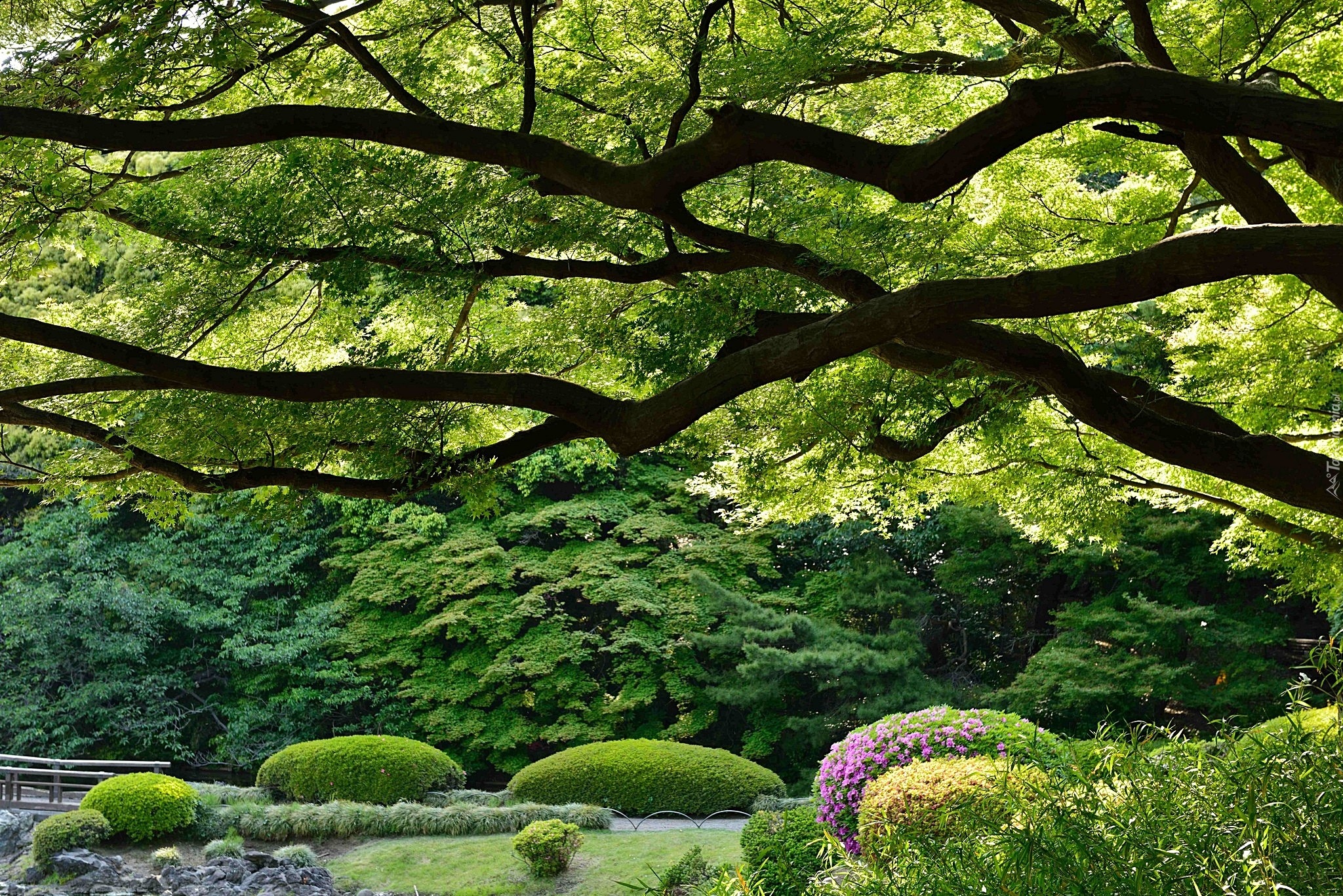 Edytor tapety: Park, Rozłożyste, Drzewo, Klomby, Mostek