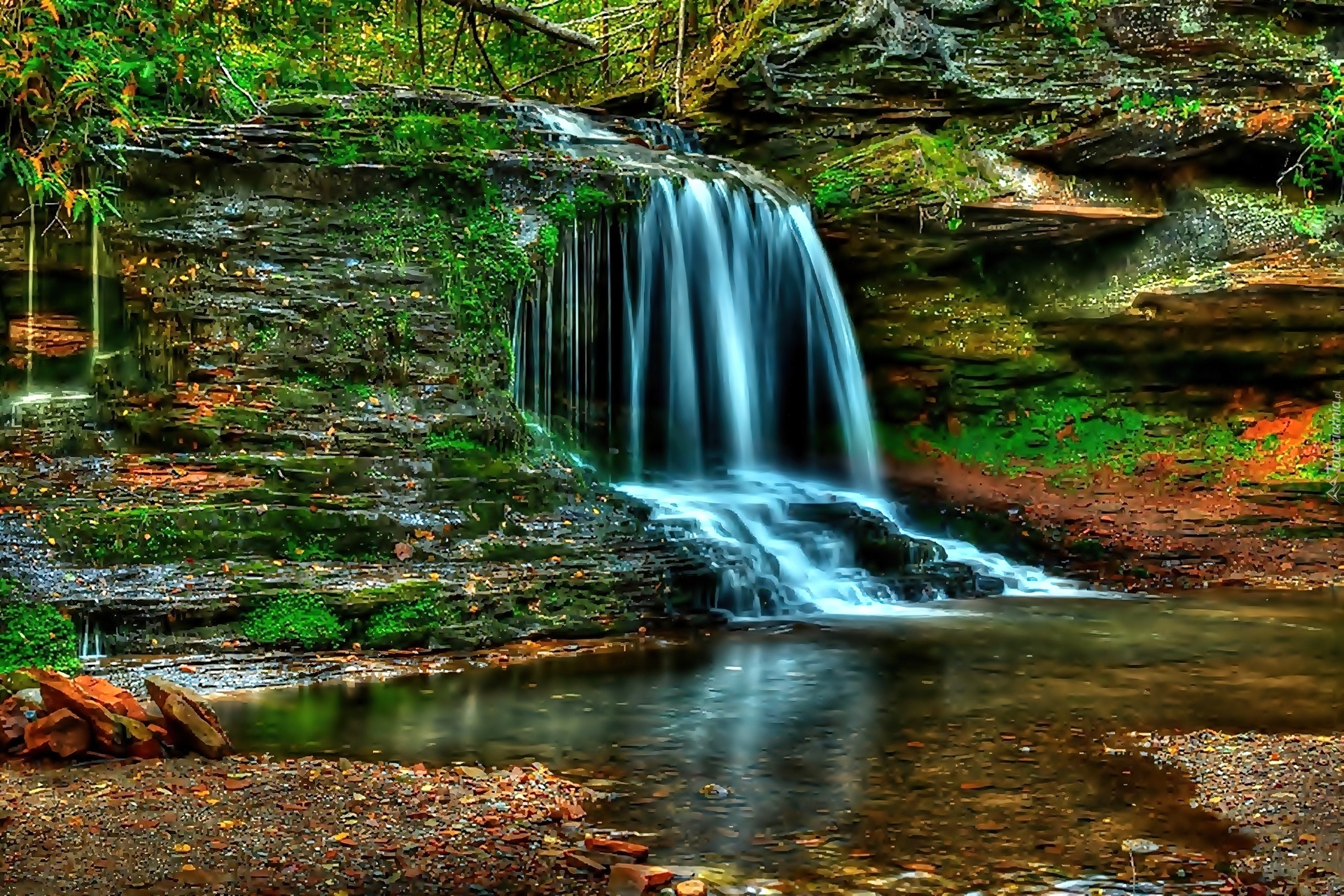 Edytor tapety: Stany Zjednoczone, Stan Wisconsin, Wodospad Lost Creek Falls, Skały, Mchy, Jeziorko