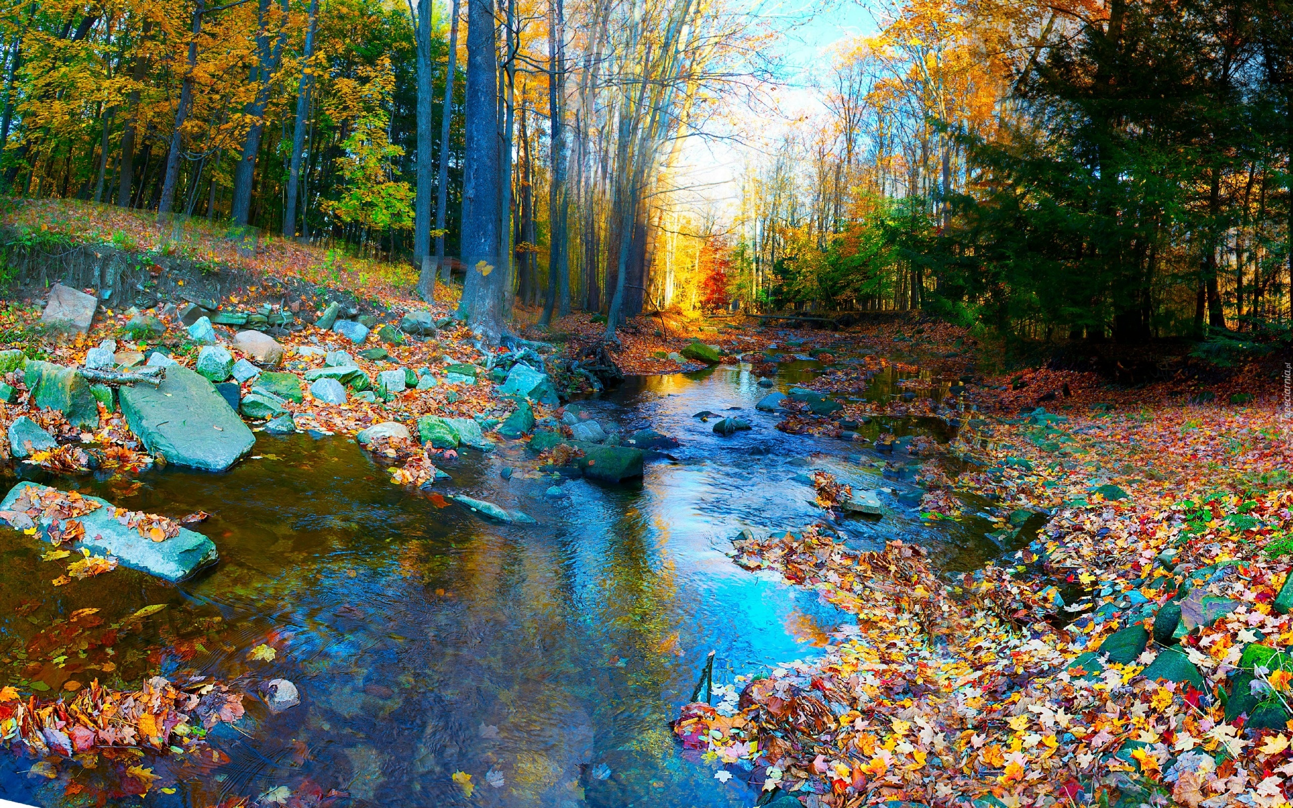 Edytor tapety: Las, Rzeczka, Kamienie, Przebijające, Światło, Jesień