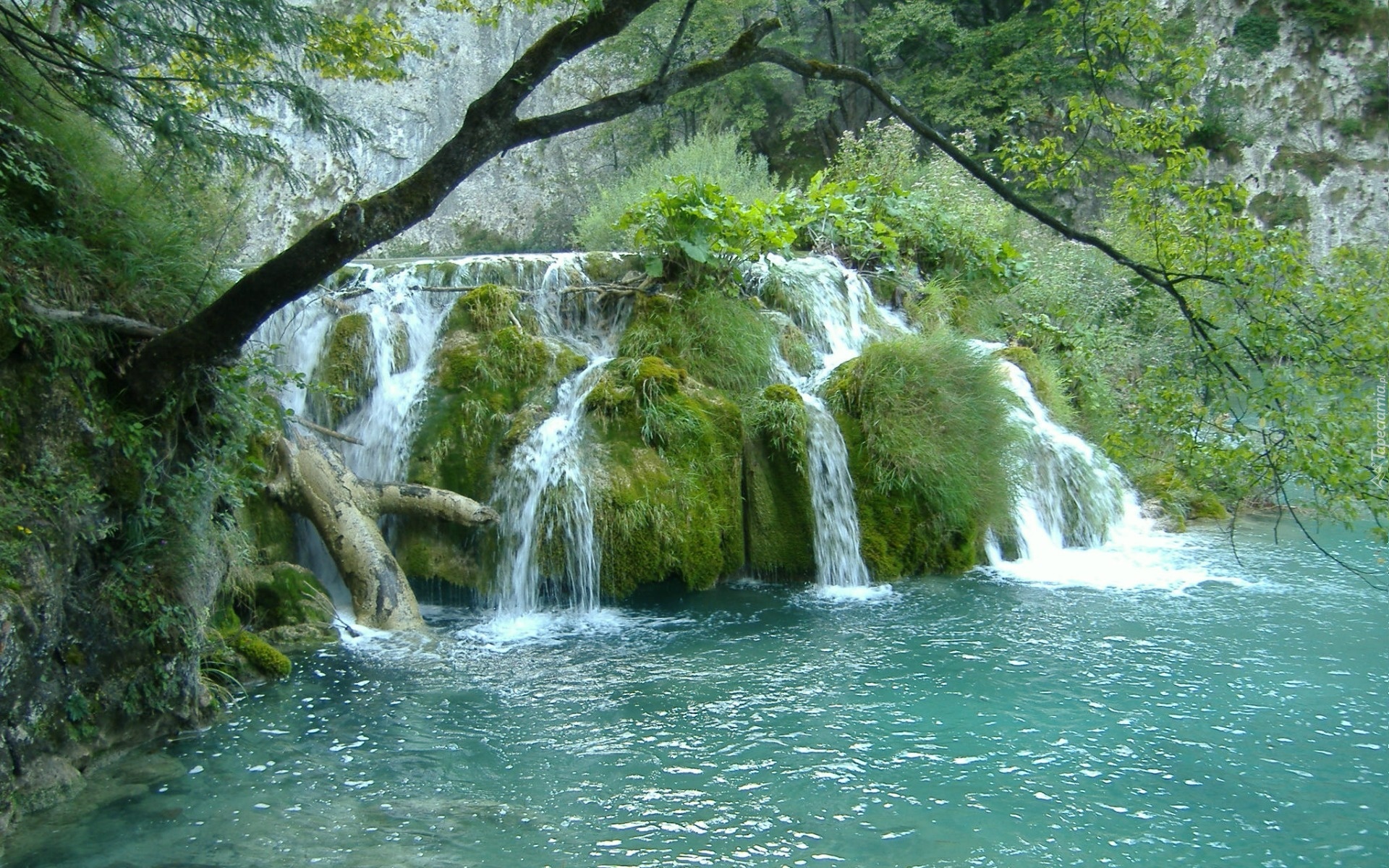 Edytor tapety: Wodospad, Skała, Drzewa, Krzewy