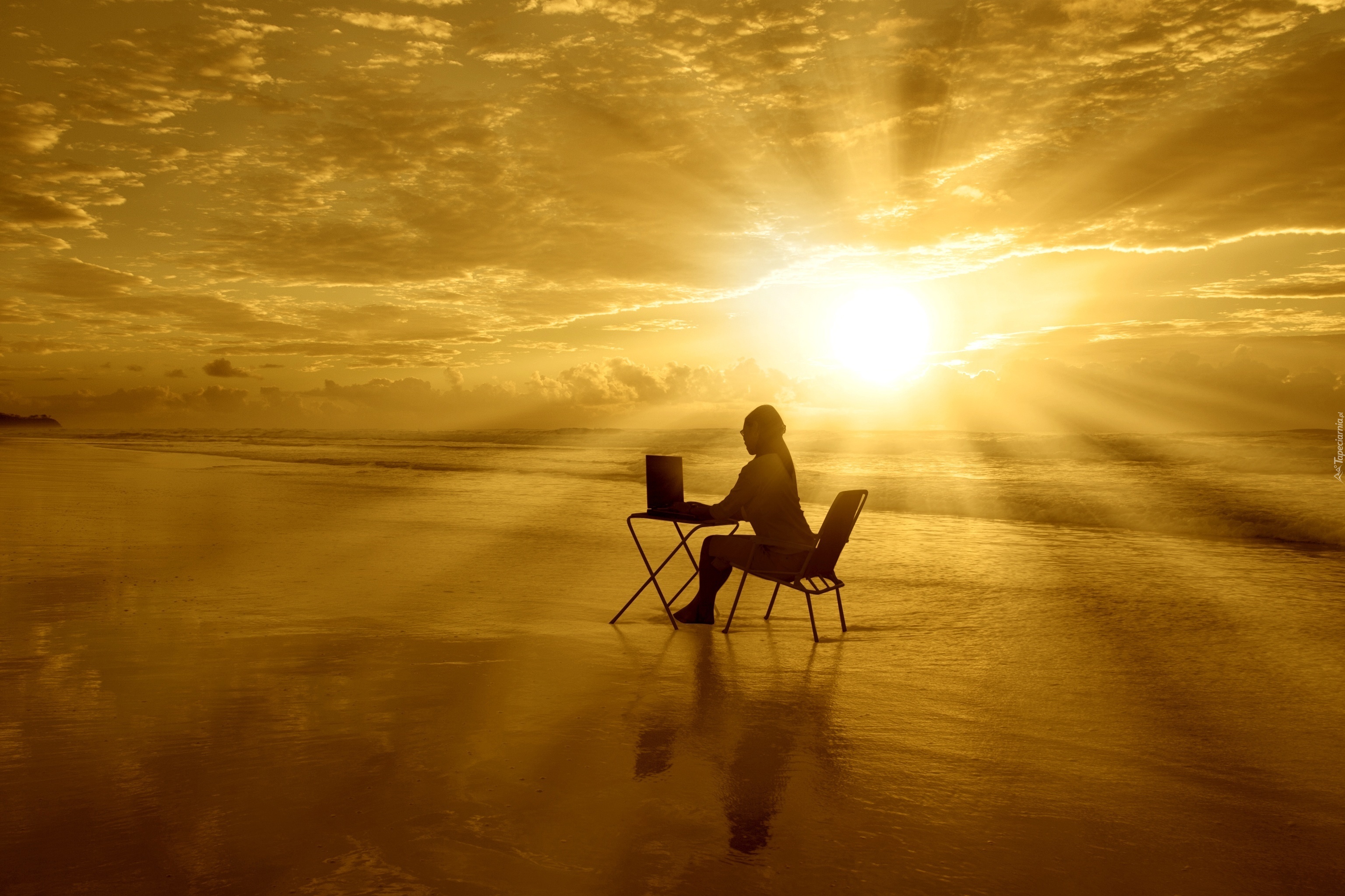 Edytor tapety: Zachód, Słońca, Promienie, Morze, Plaża, Kobieta