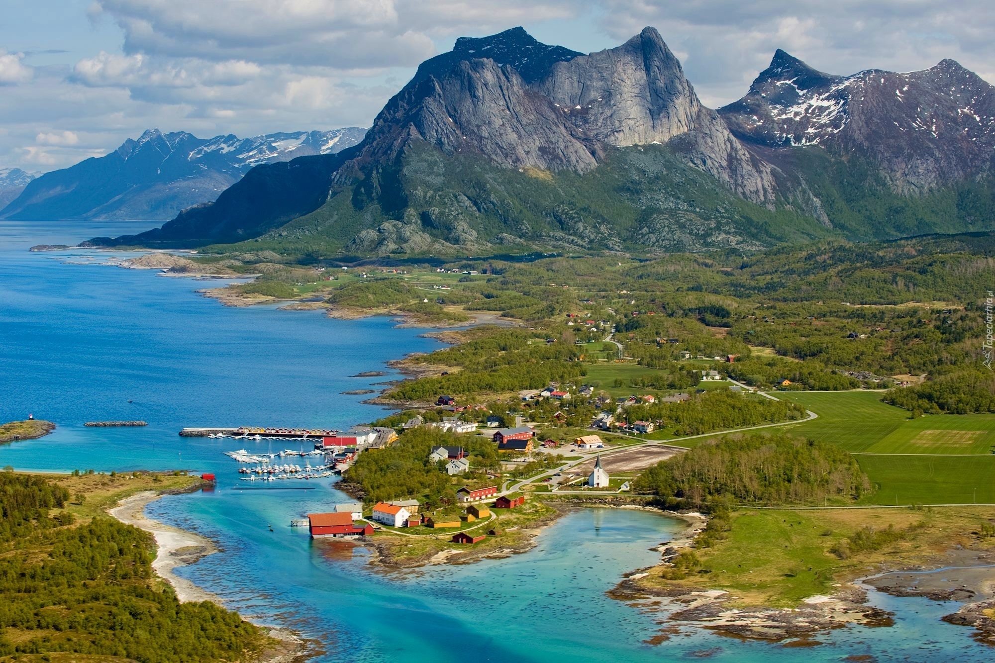 Edytor tapety: Zatoka, Osada, Przystań, Góry