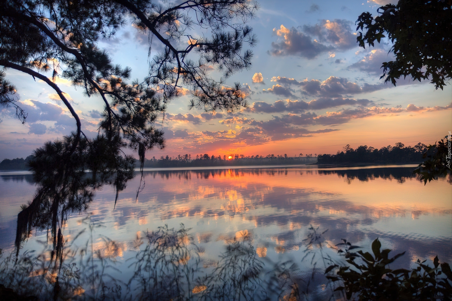 Edytor tapety: Jezioro, Gałęzie, Zachód Słońca