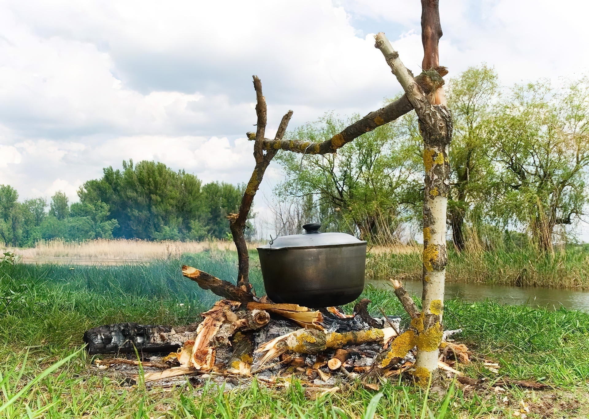 Edytor tapety: Rzeka, Łąka, Drzewa, Ognisko, Biwakowe