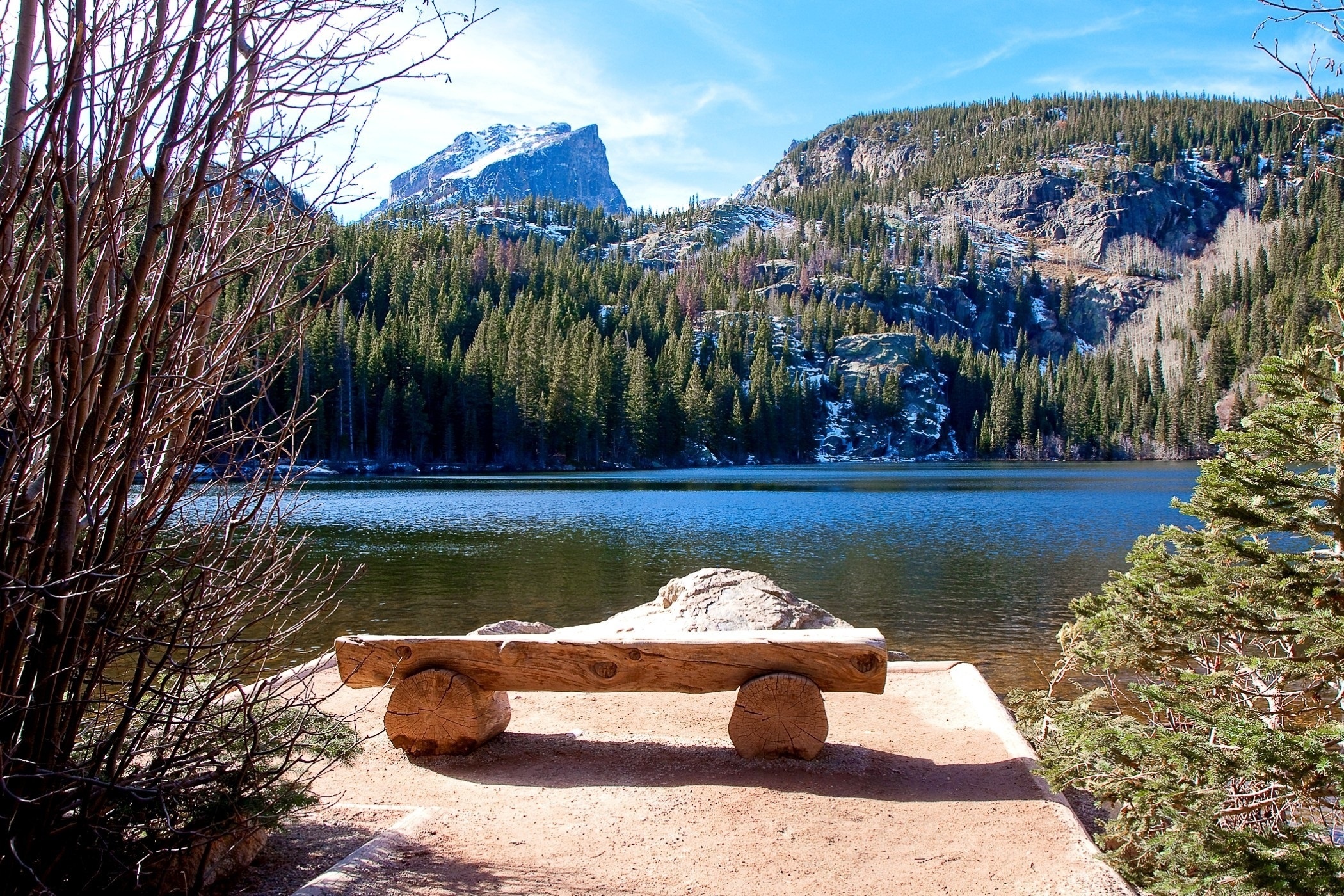 Edytor tapety: Góry, Lasy, Jezioro, Ławeczka