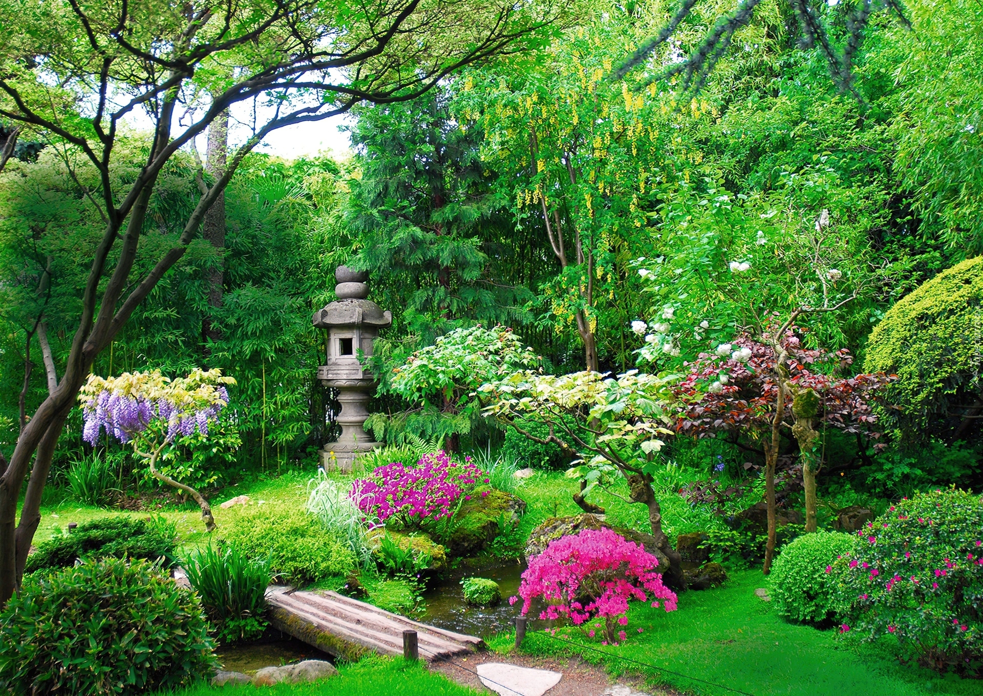 Edytor tapety: Ogród, Japoński, Mostek, Strumyk, Kolumienka