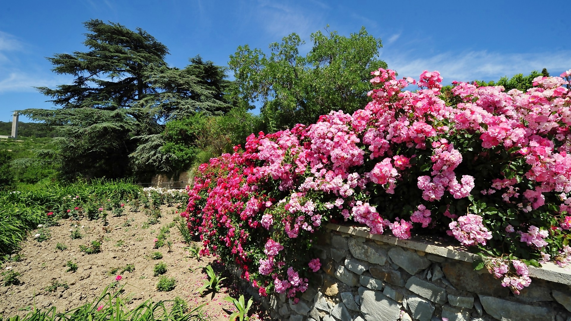 Edytor tapety: Ogród, Drzewa, Murek, Kwitnące, Krzewy, Różane