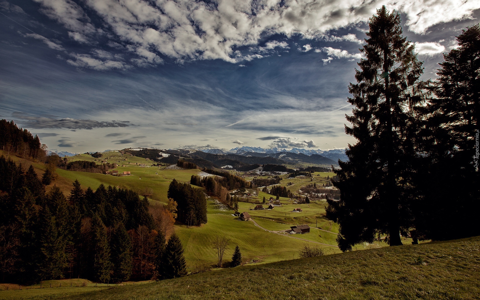 Edytor tapety: Góry, Lasy, Farmy, Pola, Chmury